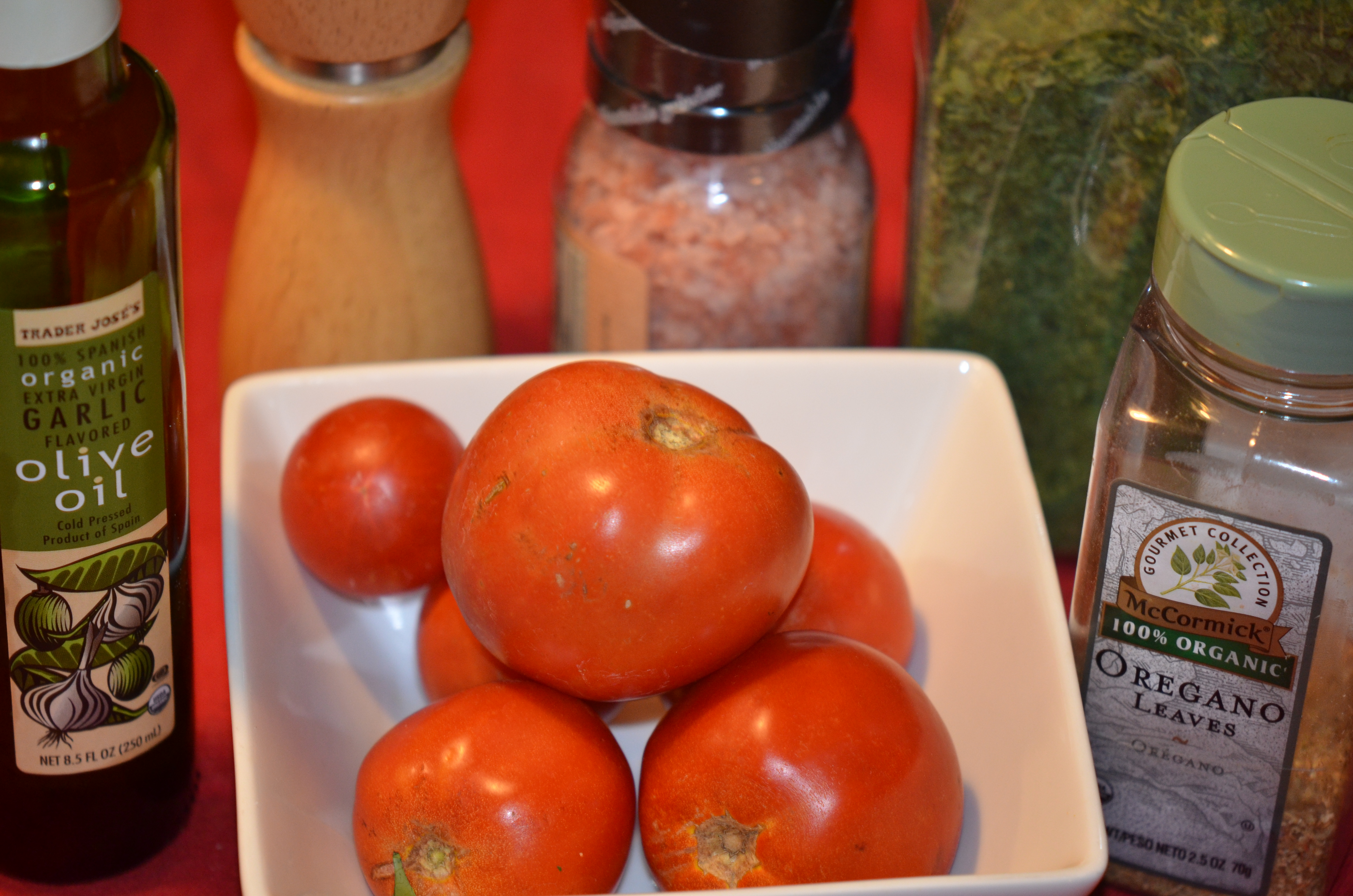 4 large tomatoes (I used red, heirloom tomatoes from our garden), halved and then thinly sliced into “moon” shapes