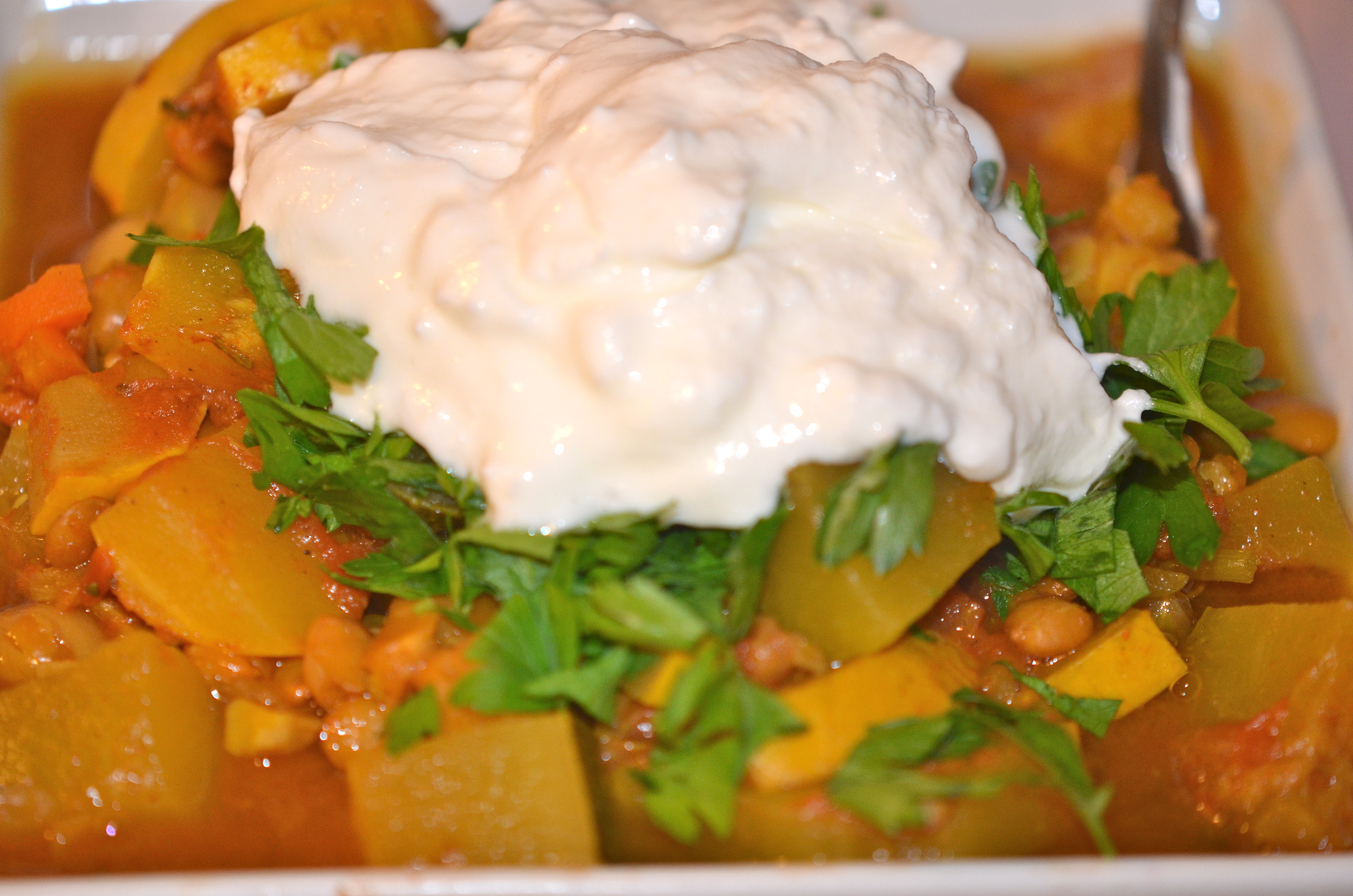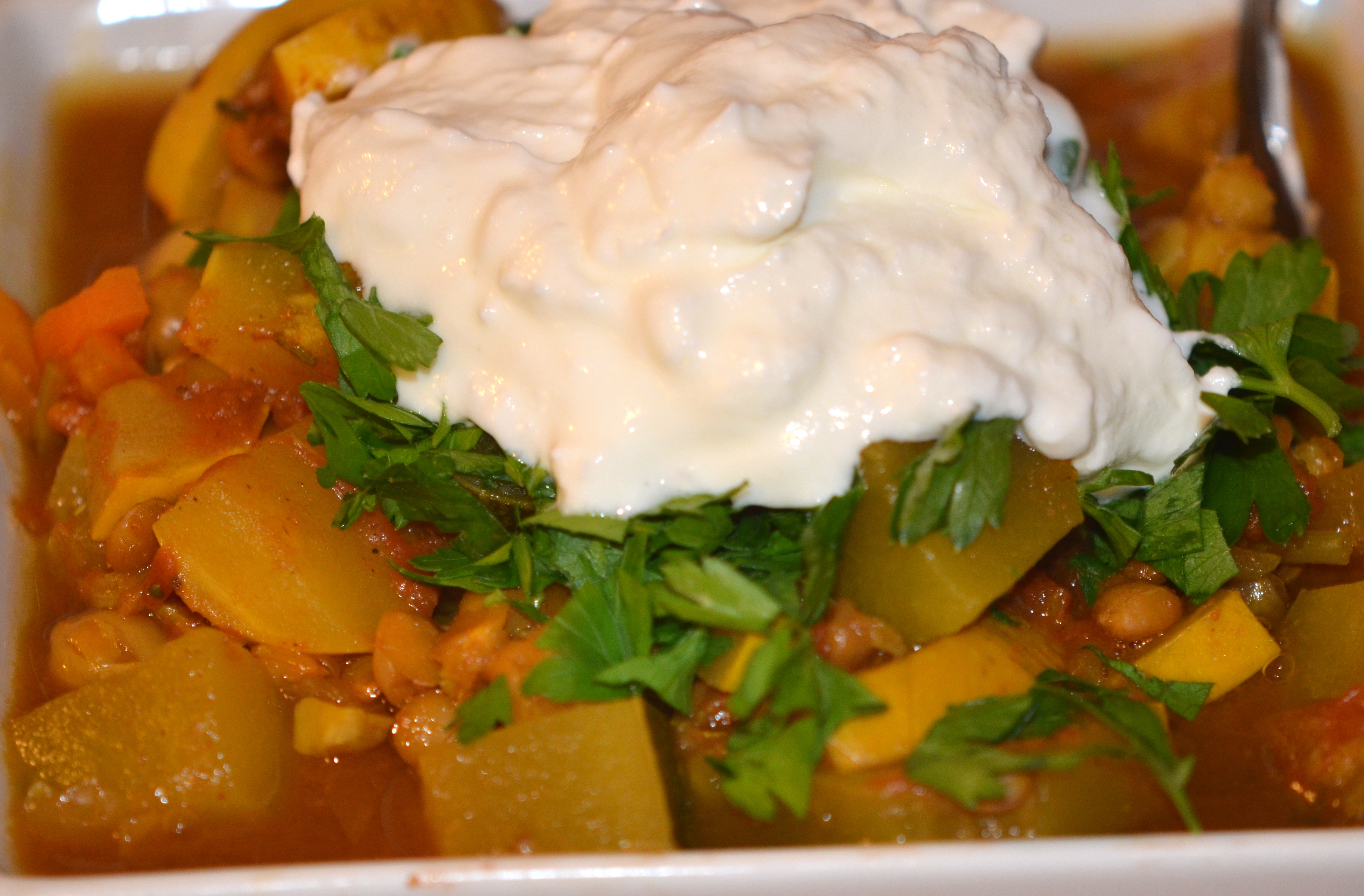 2.) Ladle spoonfuls of vegetable curry into bowls and top with herbs and Greek yogurt or sheep feta. This dish was served on a relaxing Friday night with a medium body white wine (Sancere) and a favorite bread,  honey challah.