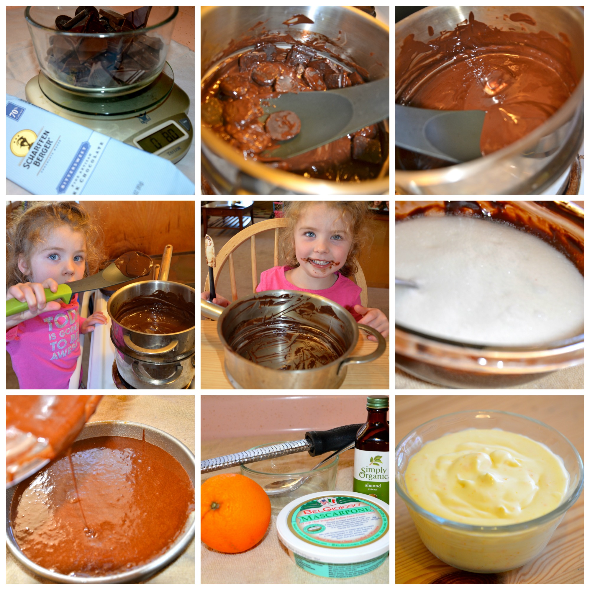 The preparation of the cake flies by, especially if your children love to bake as much as mine do. They even clean the bowls, albeit with their tongues. And remember, don’t neglect to make the orange-almond mascarpone cream. Your kids will happily lick that bowl, as well. The accompaniment takes the cake to another level. The elements of floral honey, earthy almonds and bright, crisp orange sing in unison with the creamy mascarpone. And, Ms. Chocolate never met a Mr. Orange that she didn’t like (oh, and yes, chocolate is definitely a woman).