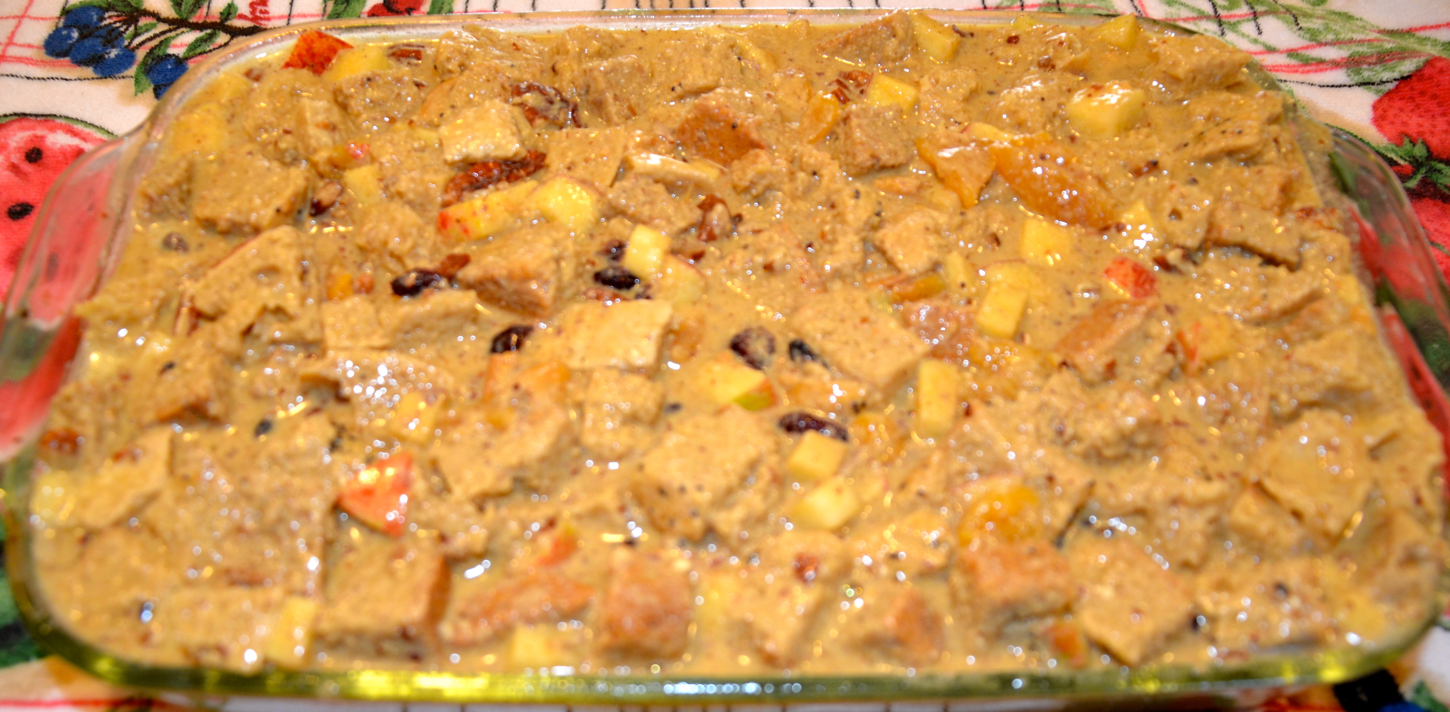 The dish is moist and decadent – not to mention healthy, light and dairy free. The abundance of healthful ingredients – whole-wheat bread, almond milk, free-range eggs and four fruits – stack the nutritional deck, so to speak. Bursting with flavor, vitamins and easy on the waistline.
