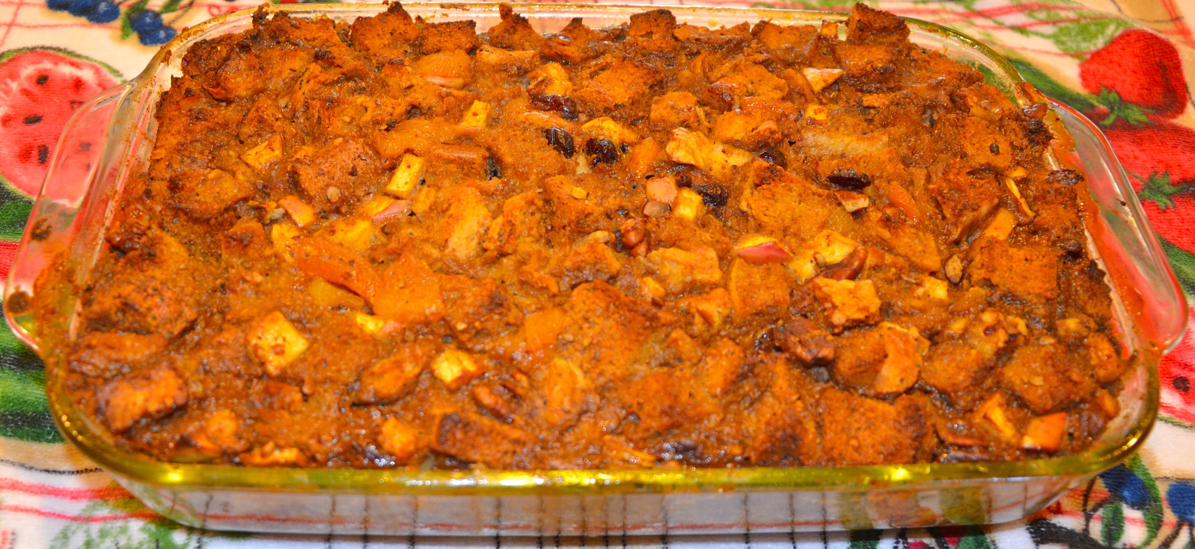 An hour later, the bread pudding is set and golden brown. It cools on a cloth and perfumes the house with the scent of apples, warm spices and fresh-baked bread. I will never buy an apple pie scented candle again!