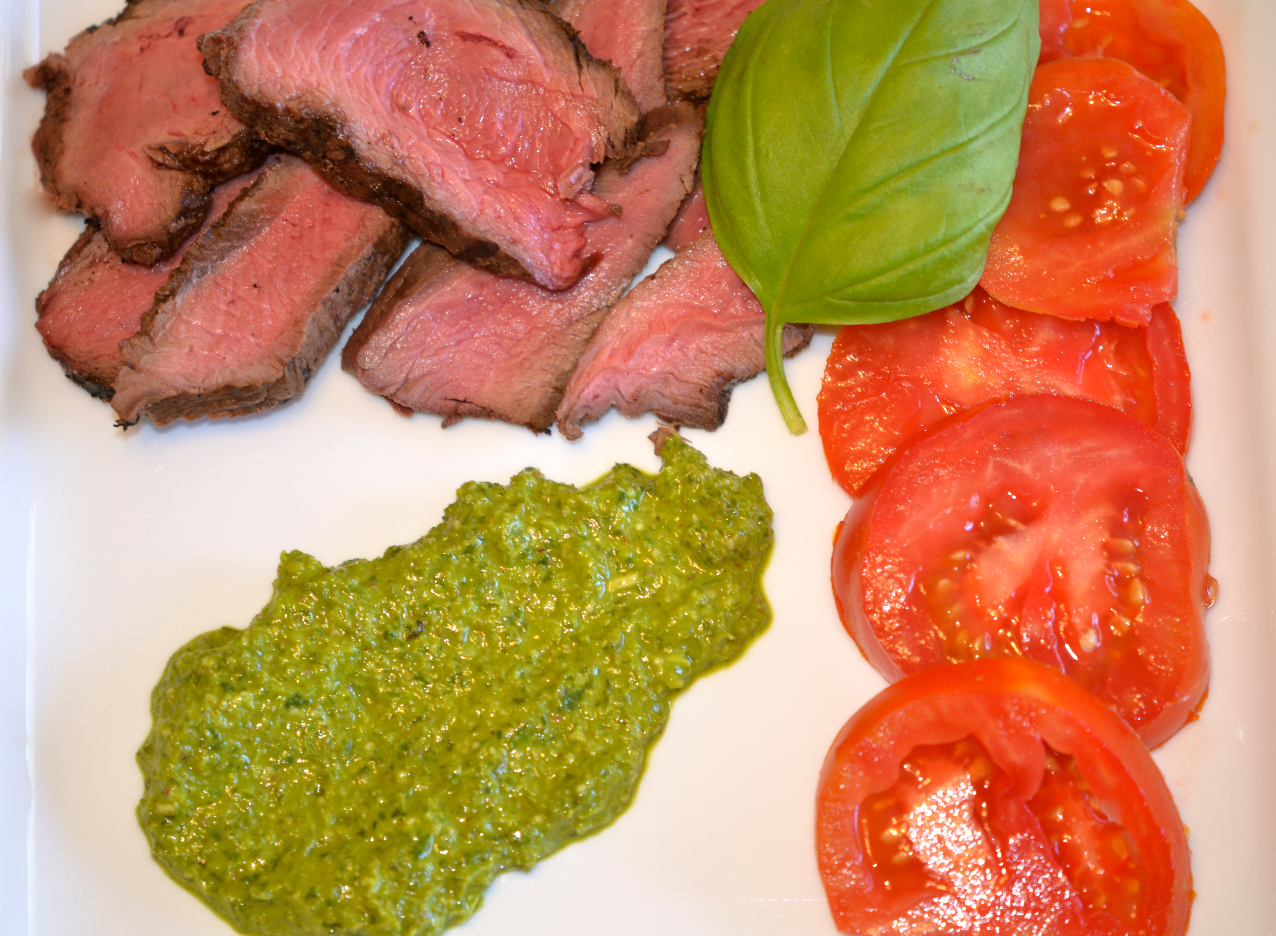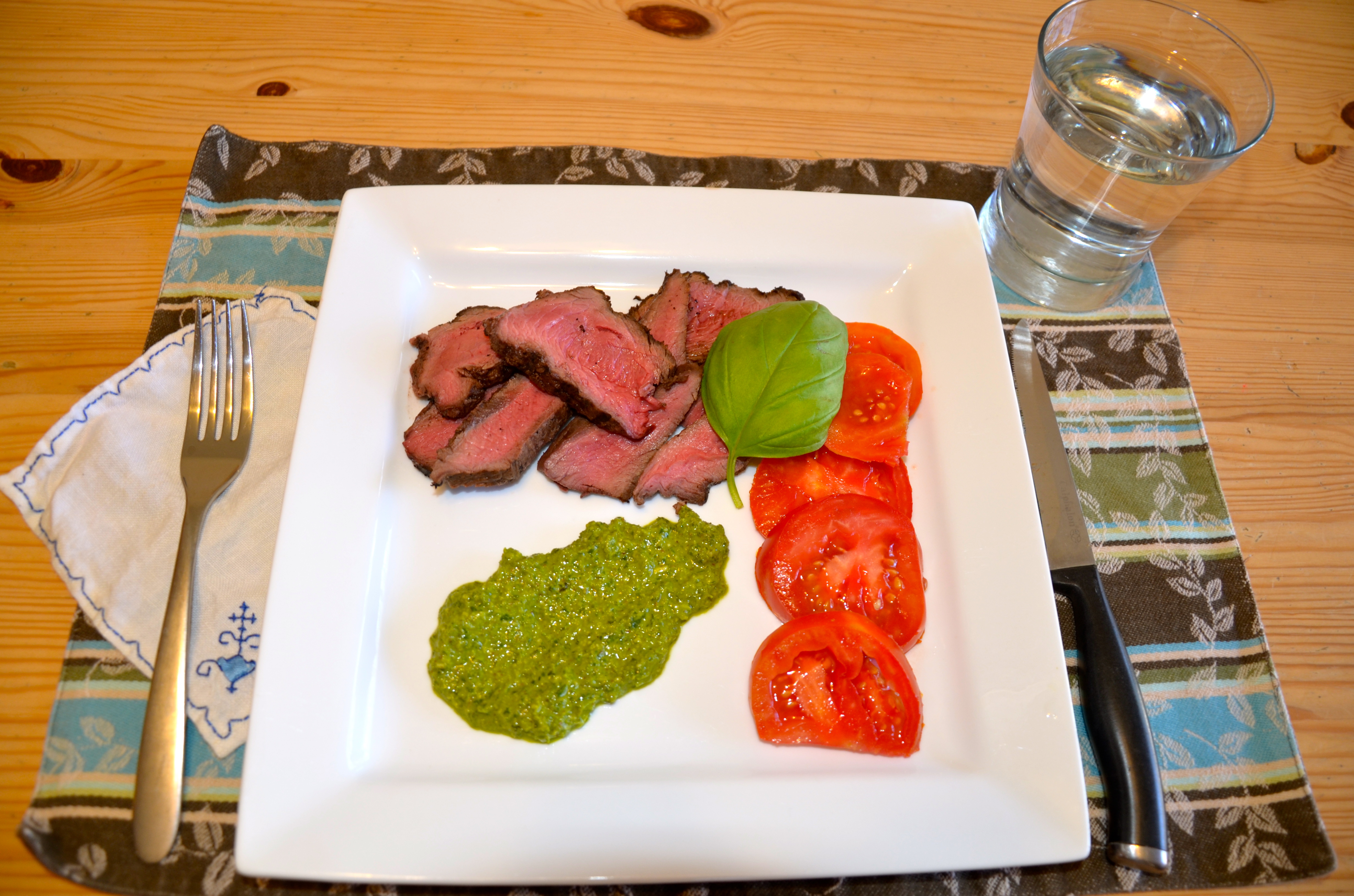 My husband, “Farmer Greg,” loves pesto on a medium-rare elk steak, sliced thinly across the grain. A friend in Albuquerque, Gayle, is married to a talented hunter of game. They have elk on their ranch in northern New Mexico. She is the most generous person I know – even with prized elk. Recently, she dropped off a large elk sirloin. Can anyone ask for a better friend?