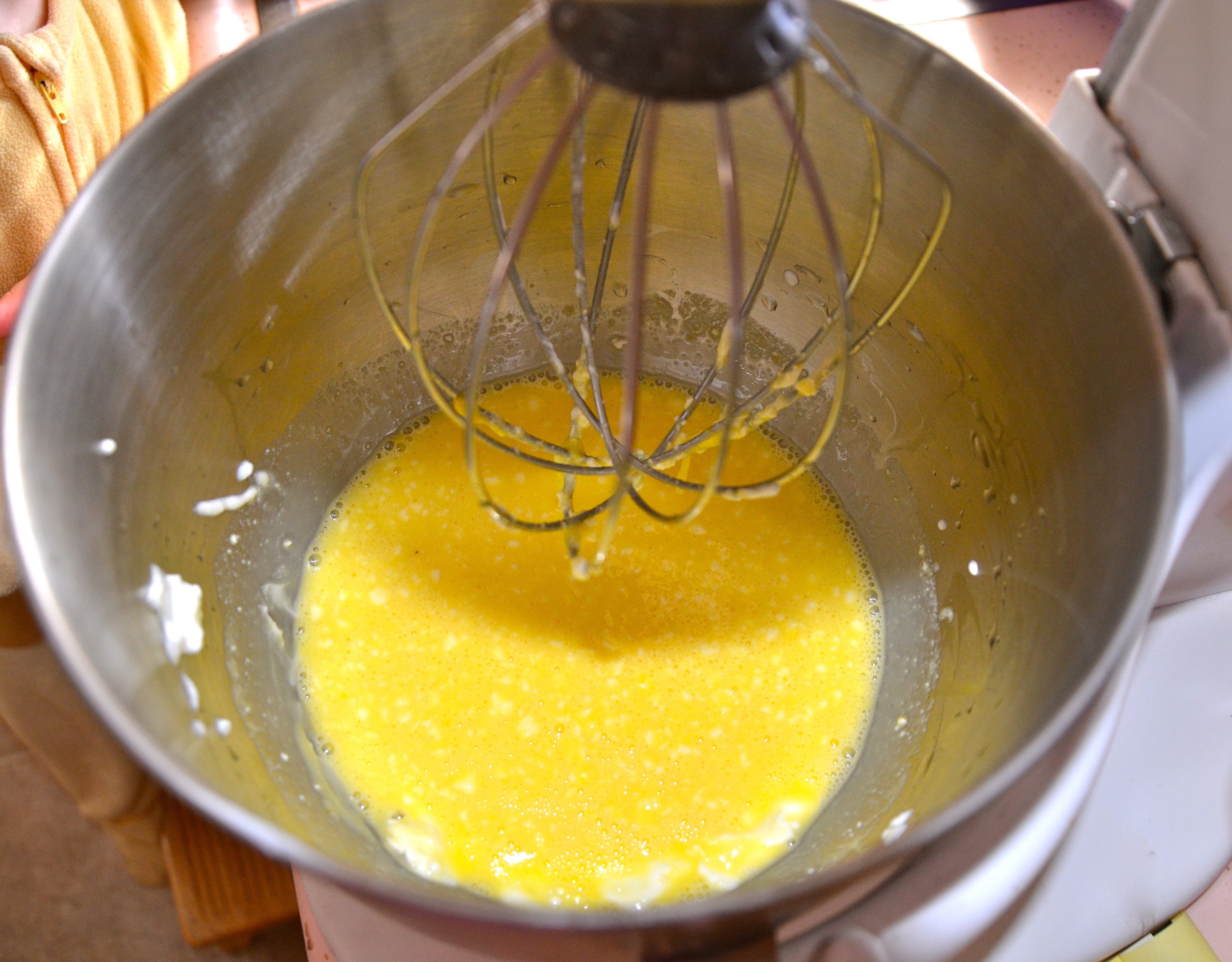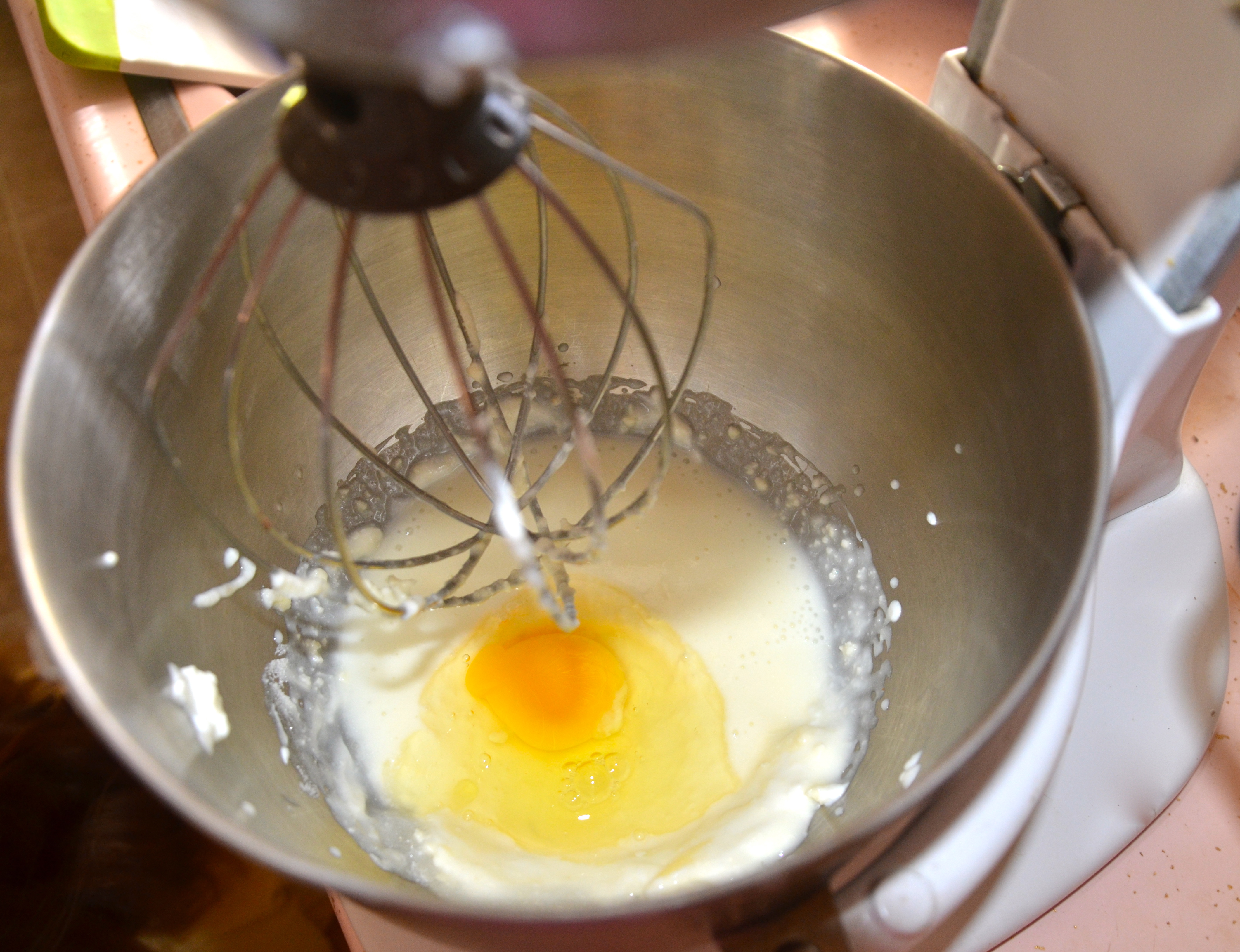 2.)  On medium-speed, use a standing mixer (or using an electric mixer) to whisk the butter, yogurt and sugar until fluffy.  Mix in the vanilla and coffee. Then, add the eggs one at a time, until combined. Scrape down the sides of the mixer.