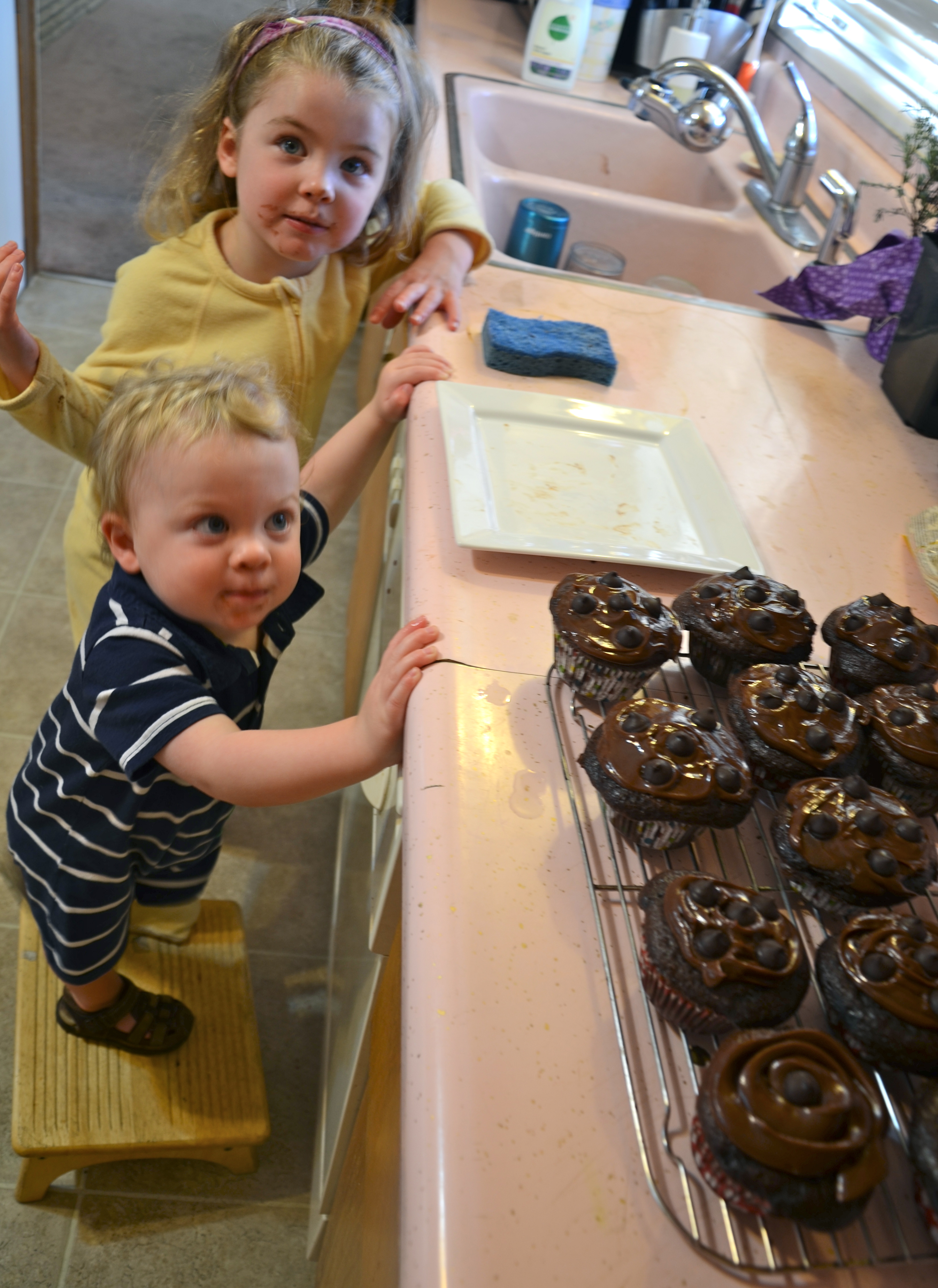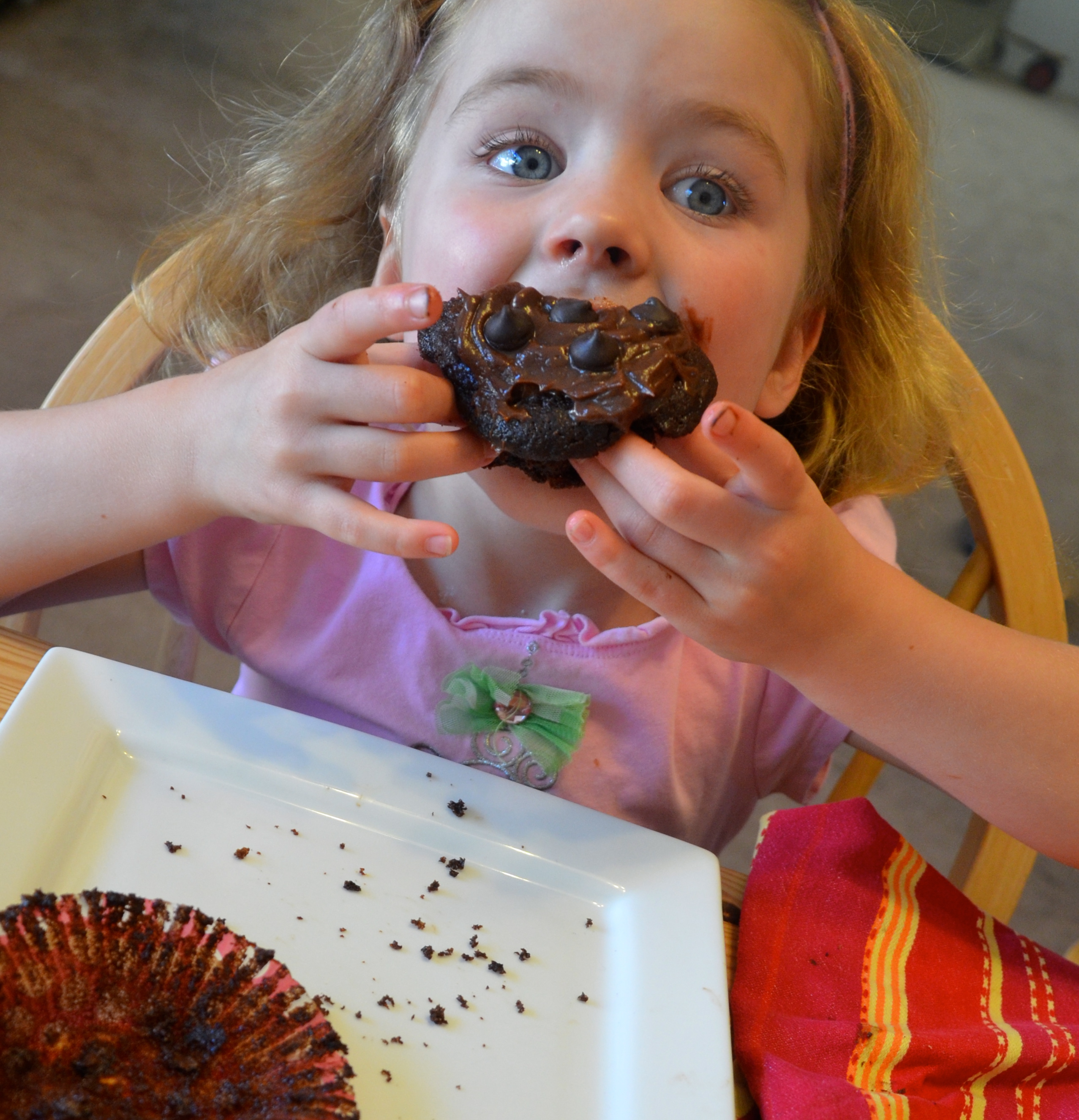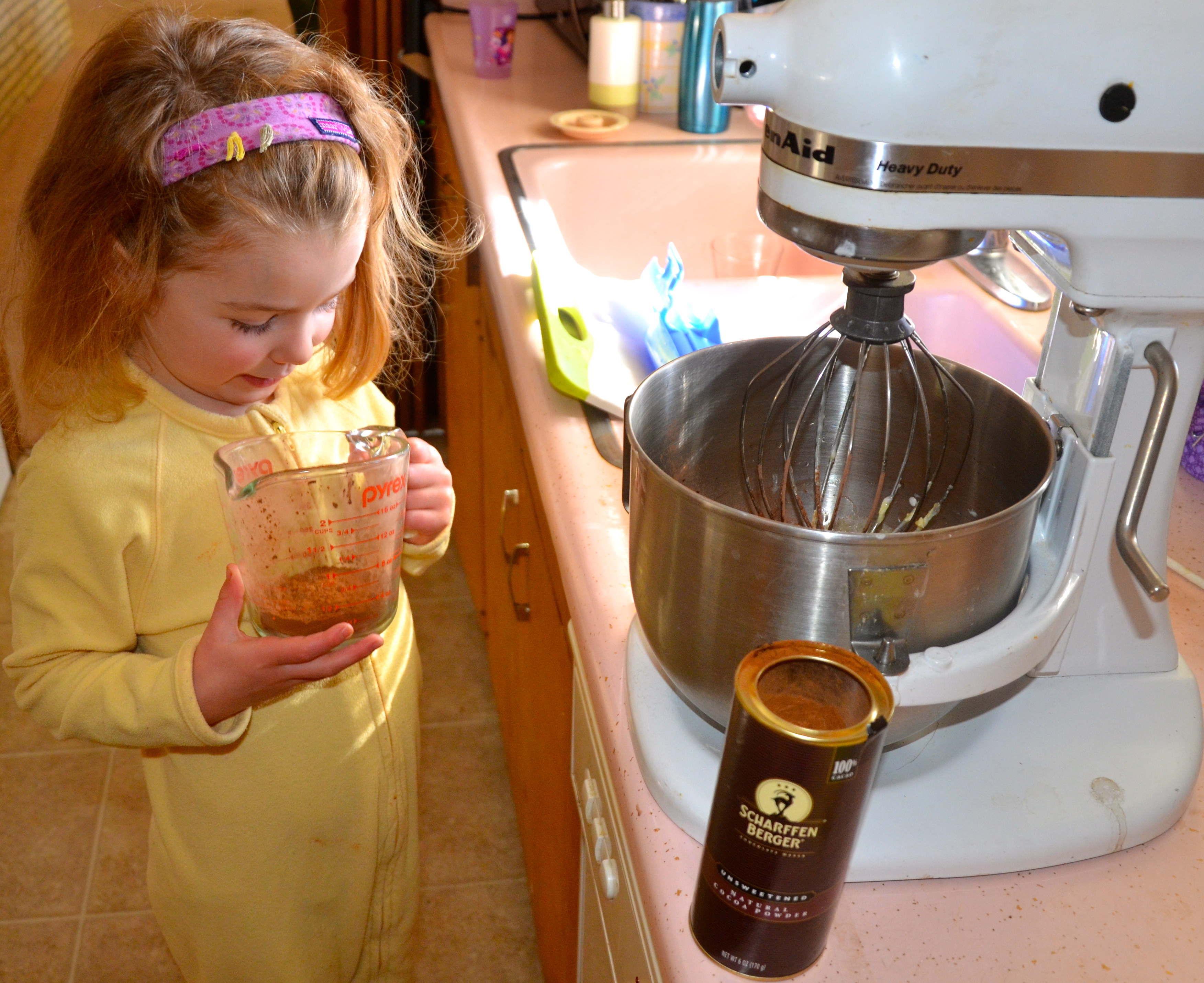There was one little hiccup during the baking session: “I don’t like coffee in my cupcakes!” exclaimed Snoo Magoo. “You won’t taste it,” I assured her. “The coffee simply brings out the chocolate flavor.” Snoo Magoo replied skeptically, “I’ll see about that! I’ll see about your recipe.” Three-years-old and already a food critic.