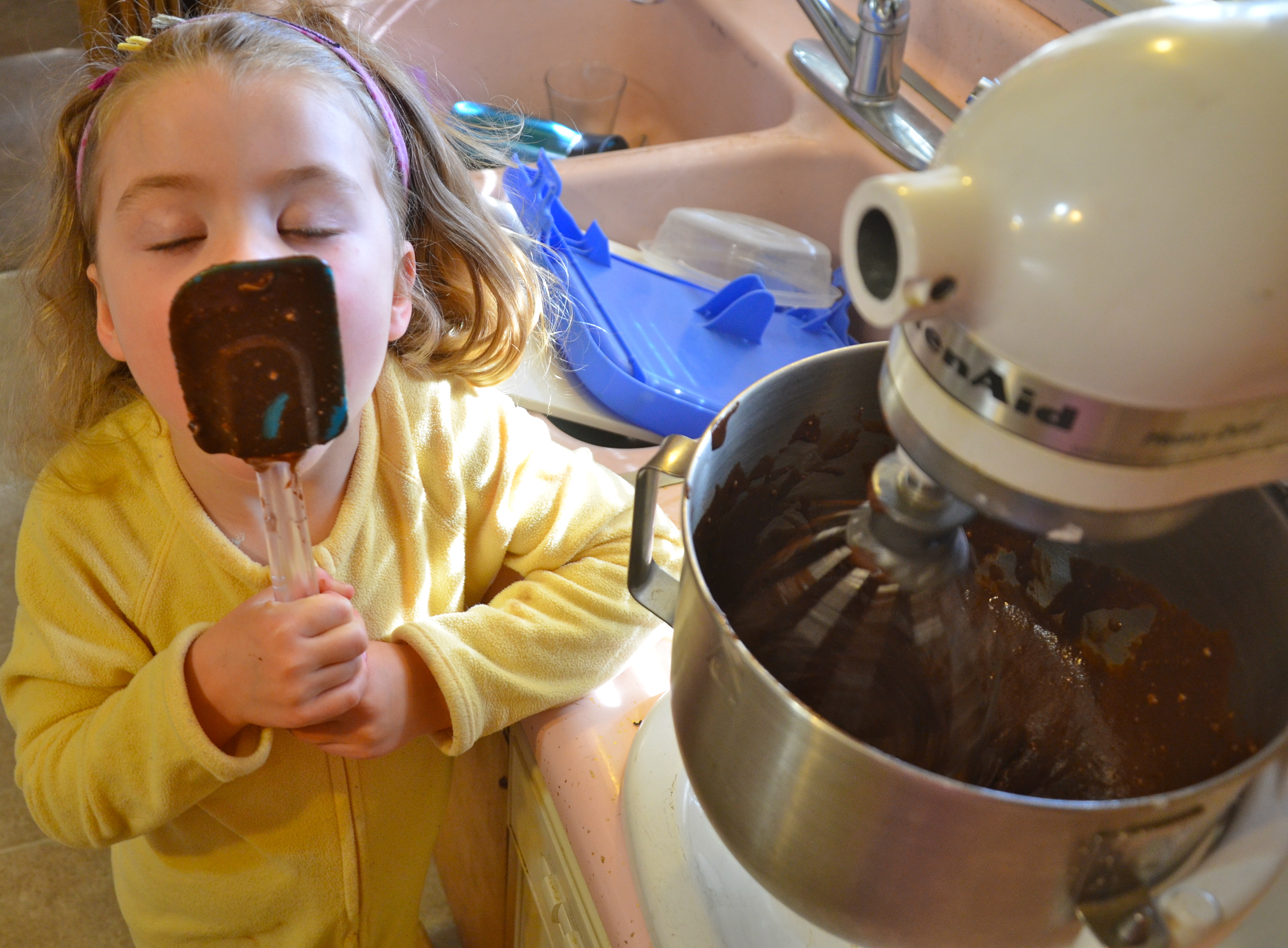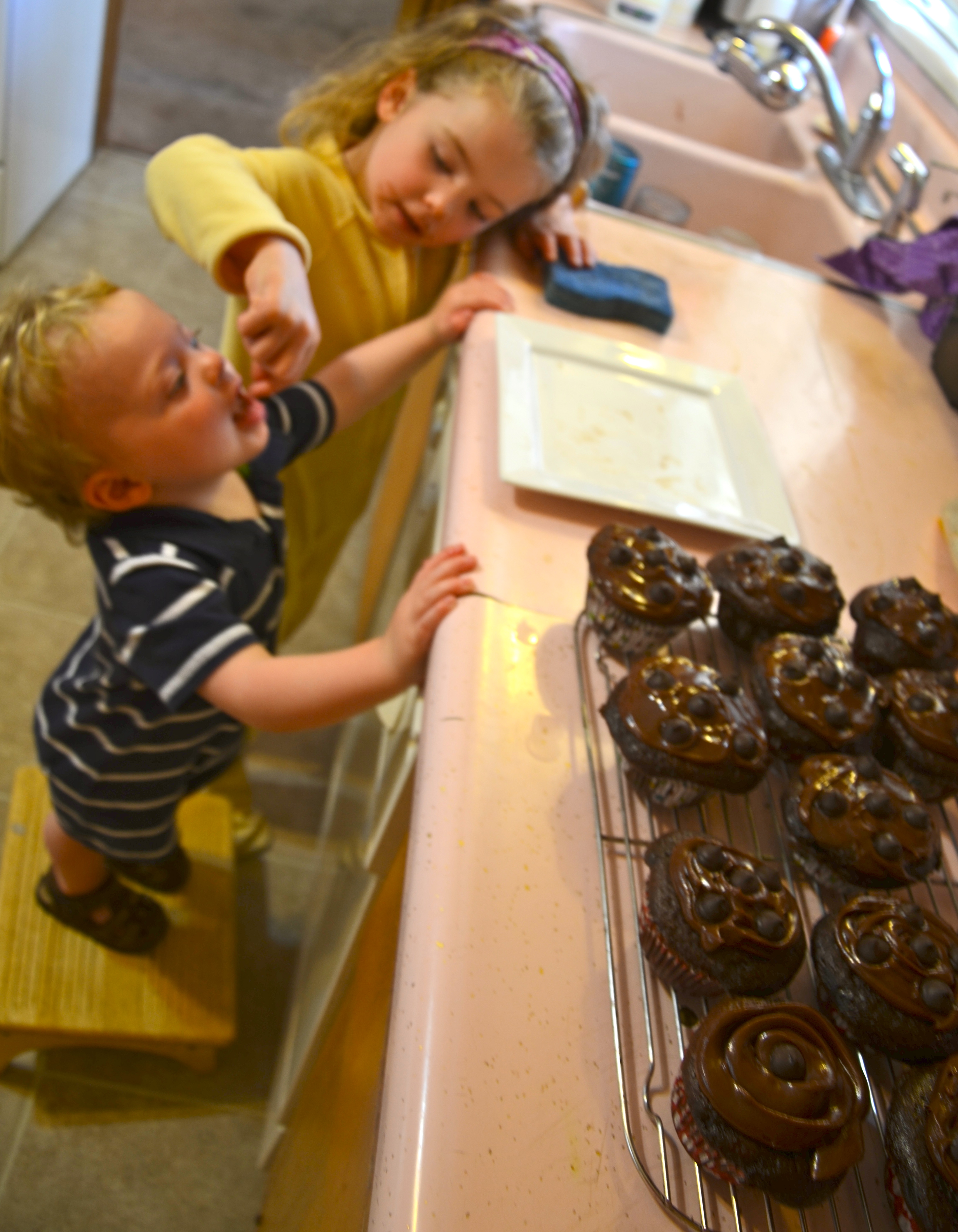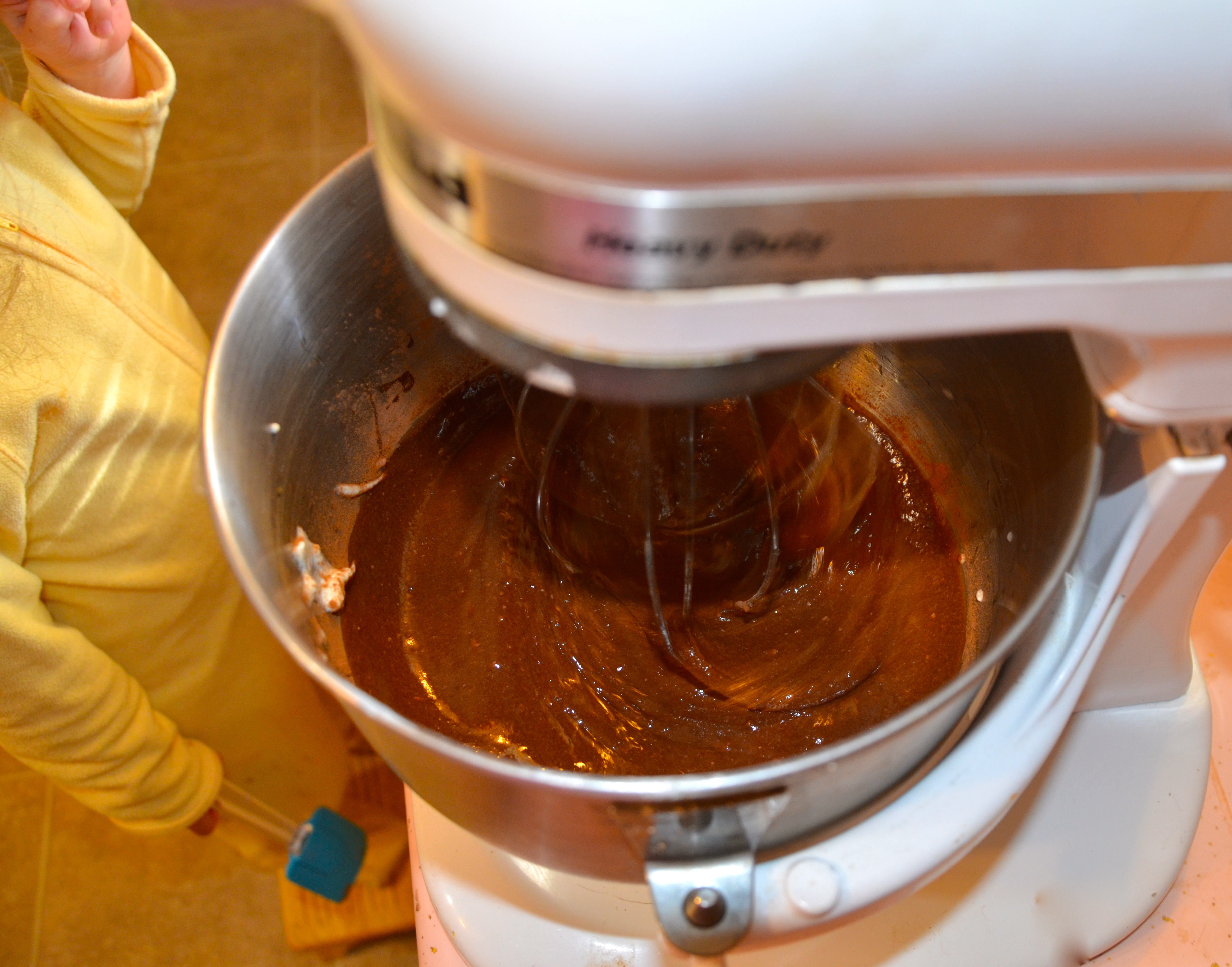 The gleaming, mocha-colored icing looks delectable, rich and decadent. Littlest Guy helps himself to a sample. Chocolate is never safe at Casa Curls and Carrots.