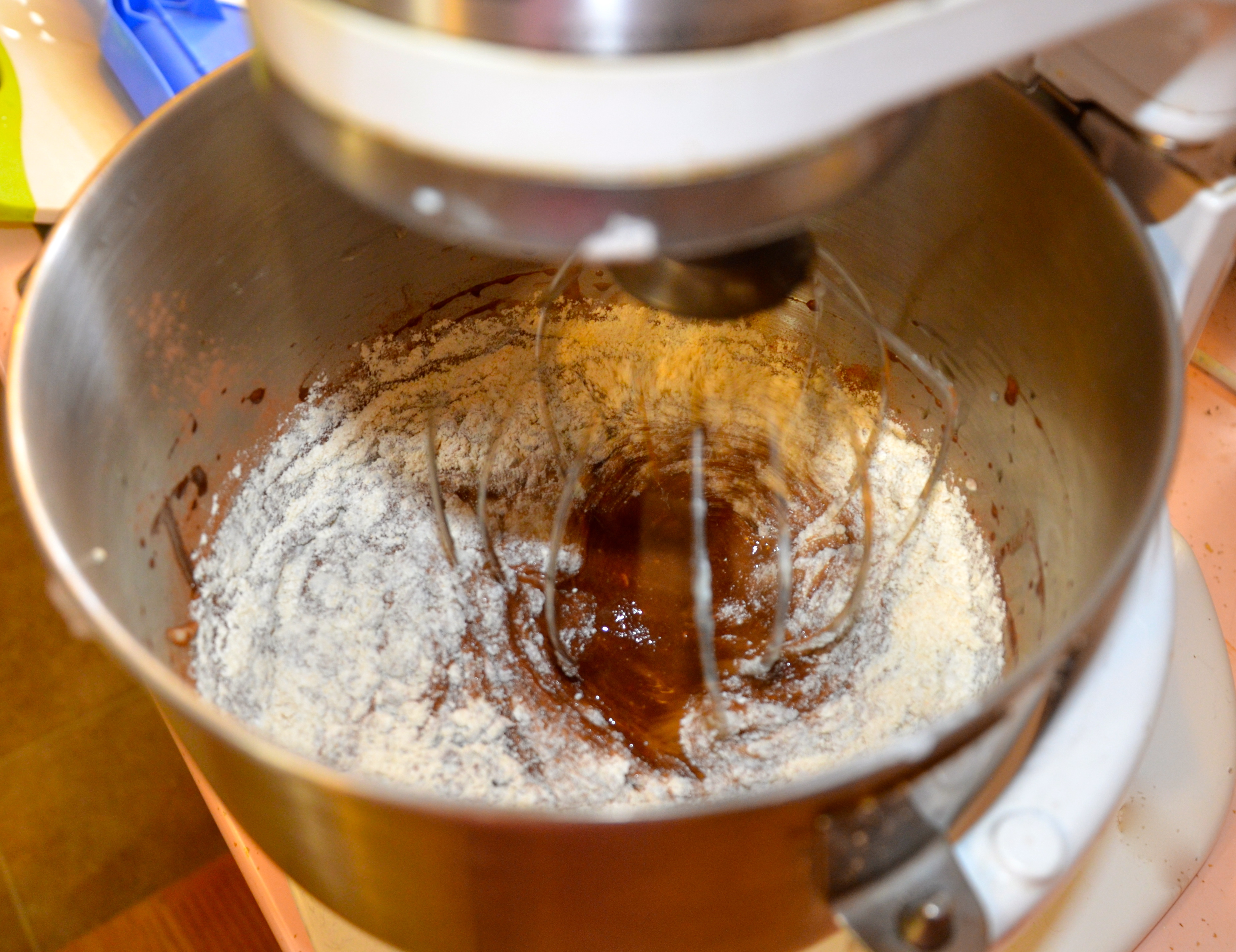 The flour and remaining dry ingredients are mixed in, a little at a time.