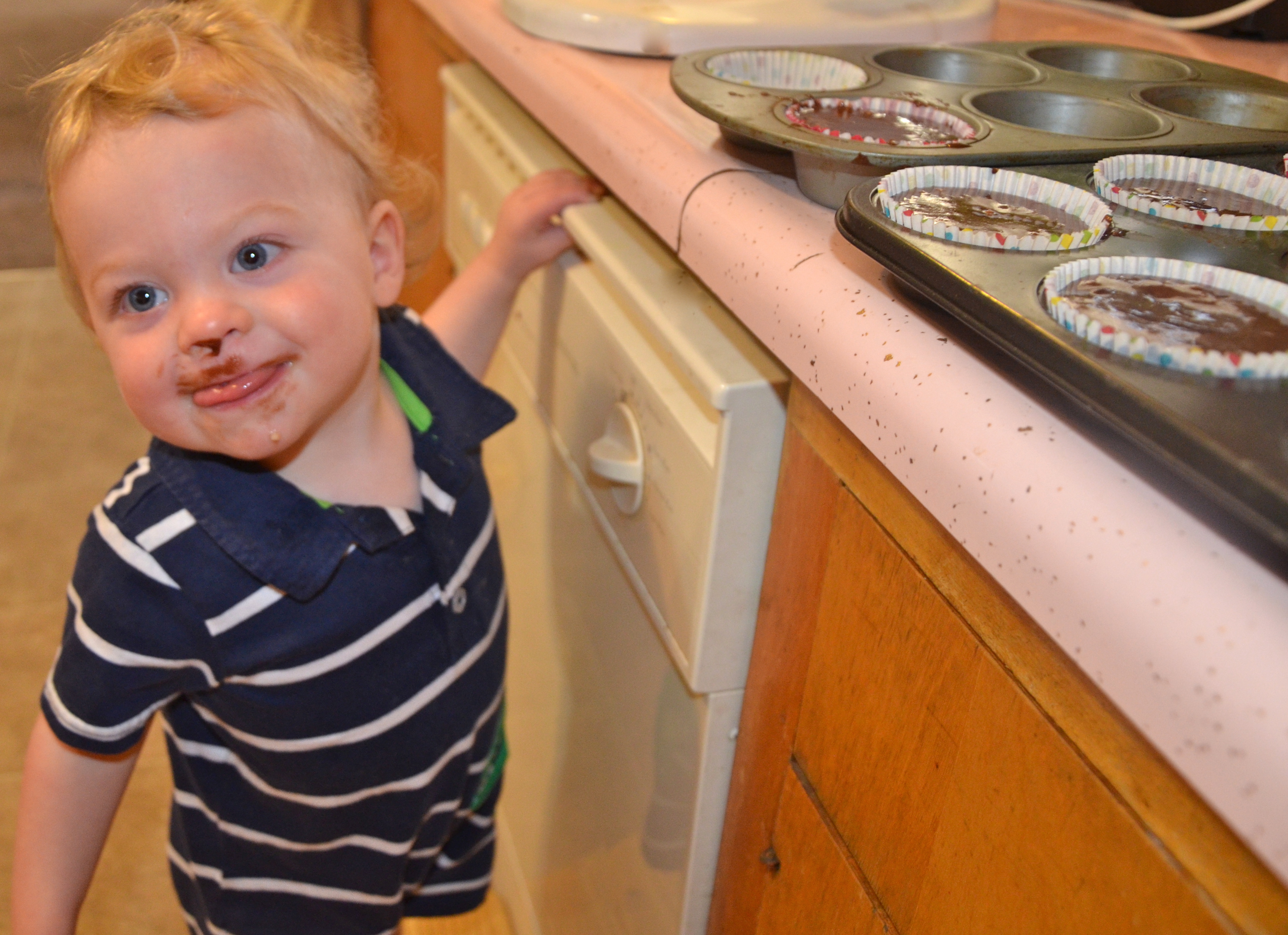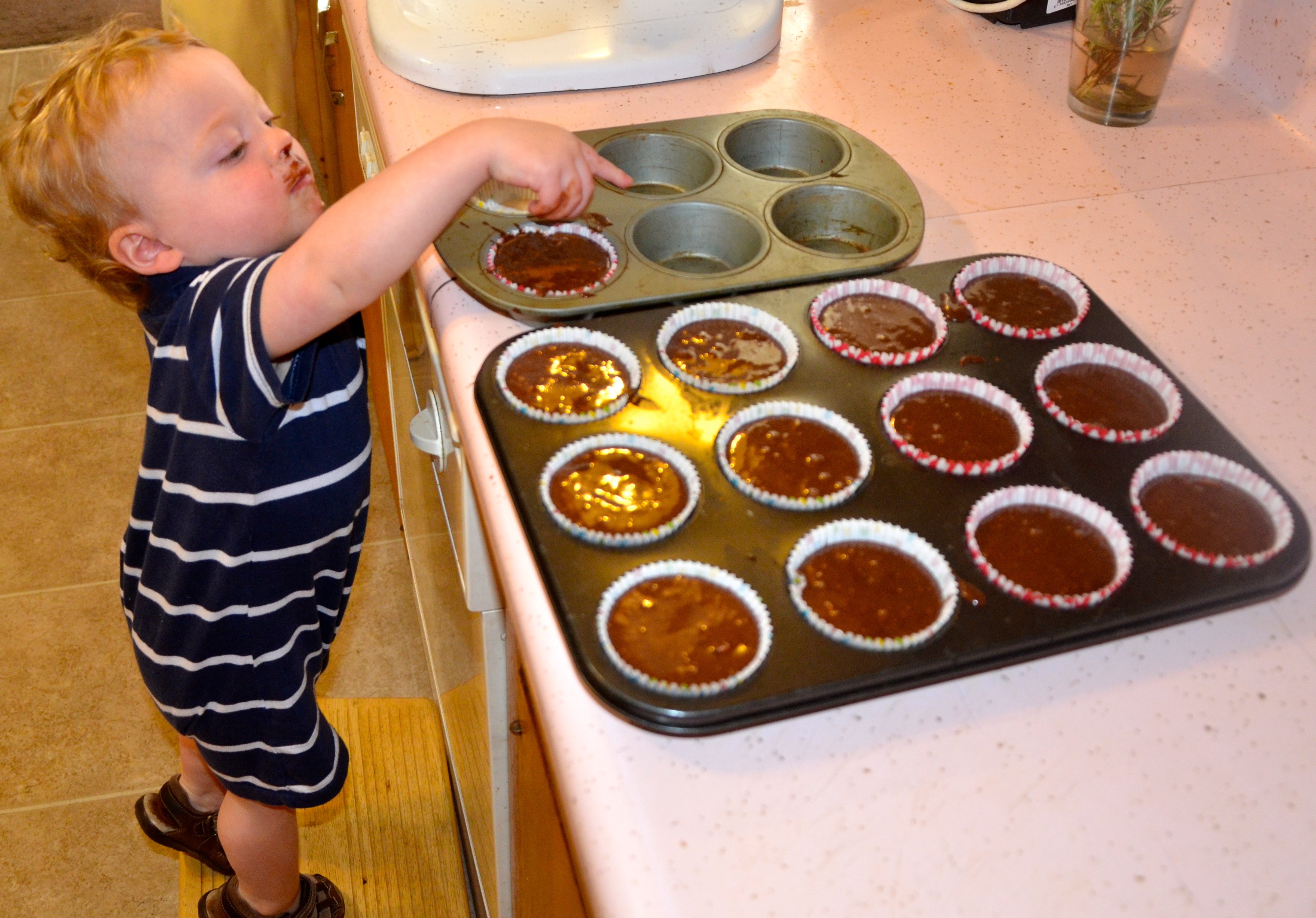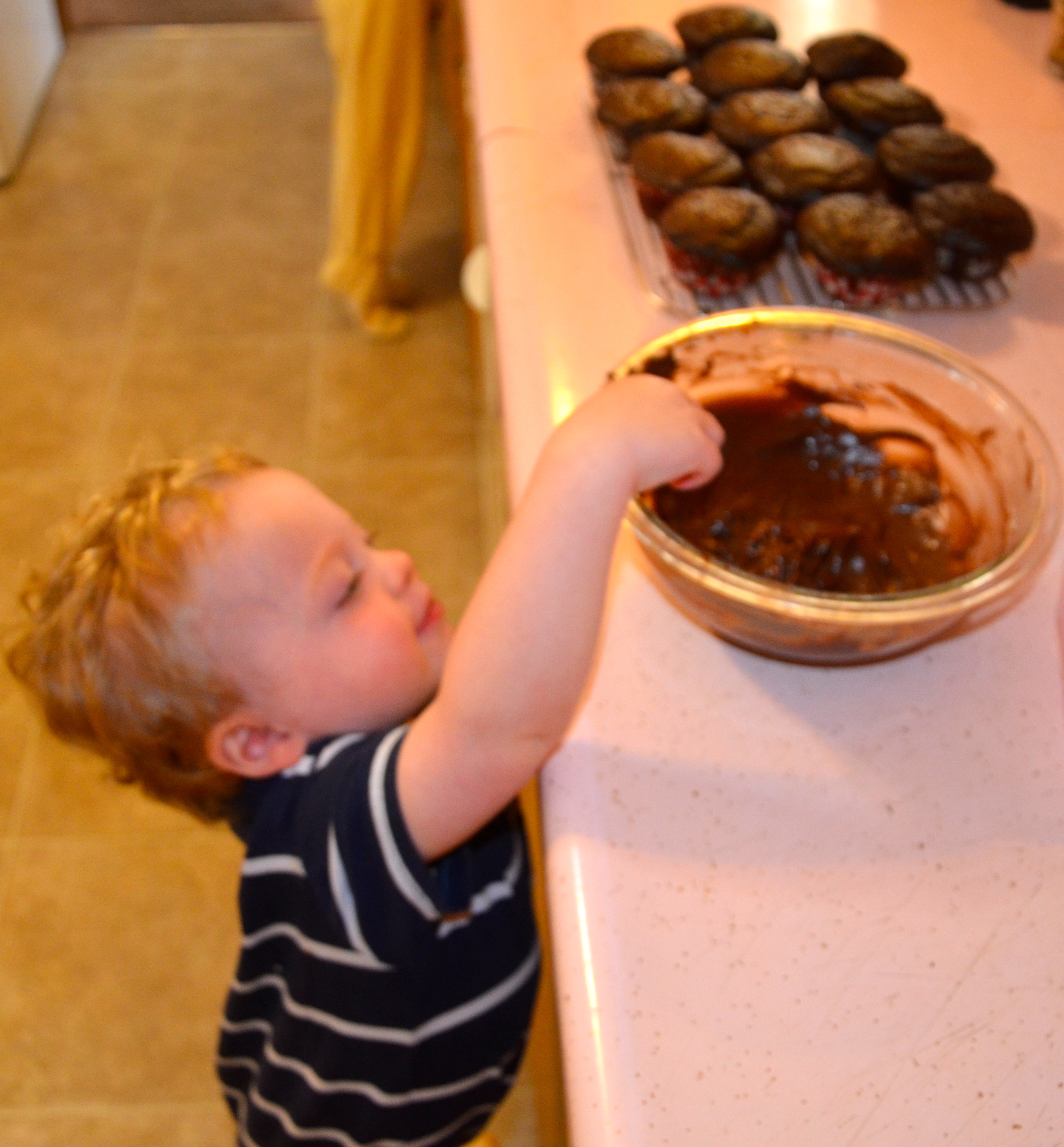Littlest Guy foils the even distribution theory. That sneaky munchkin hones in on the glistening chocolate batter and makes his move.
