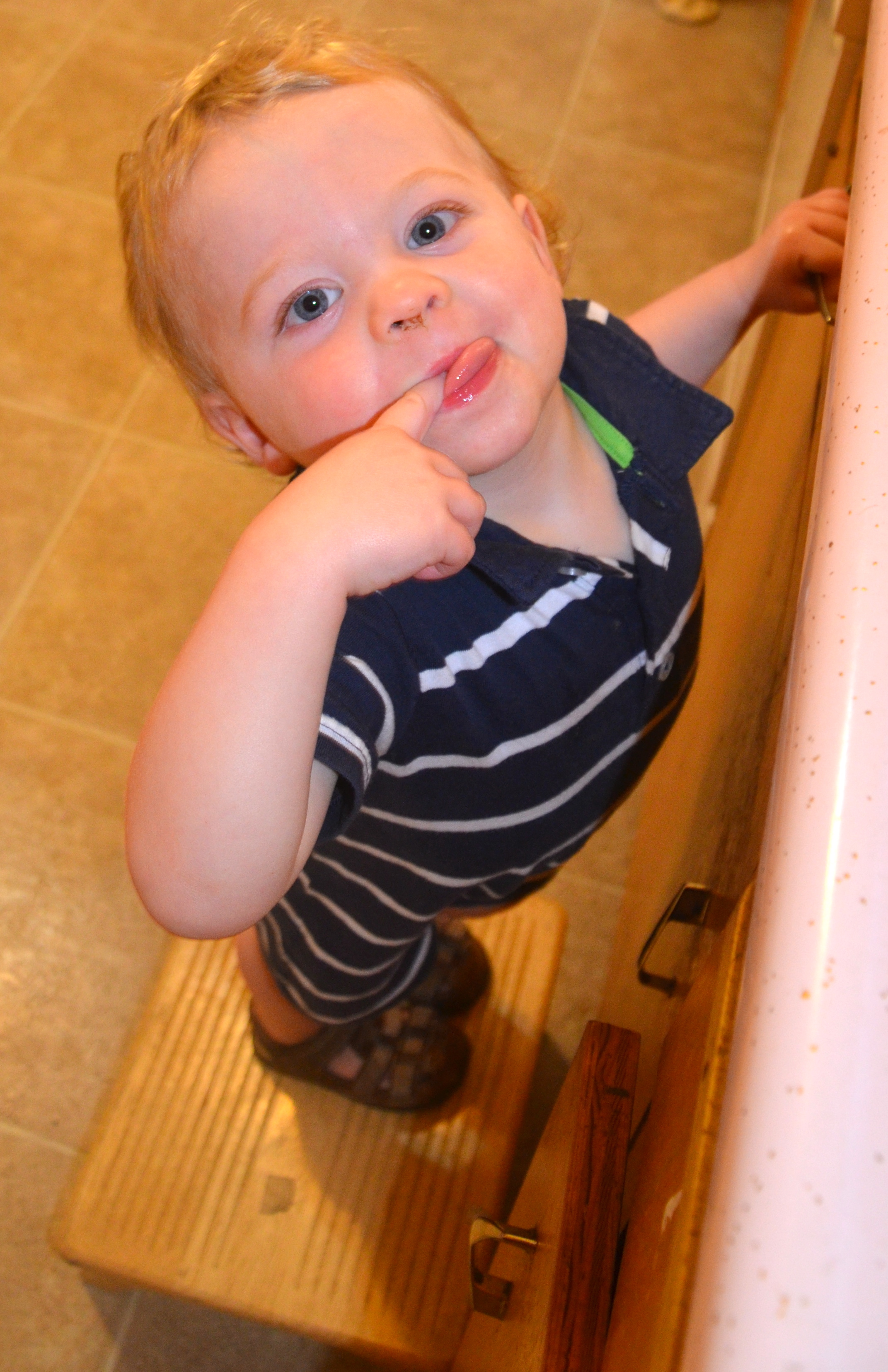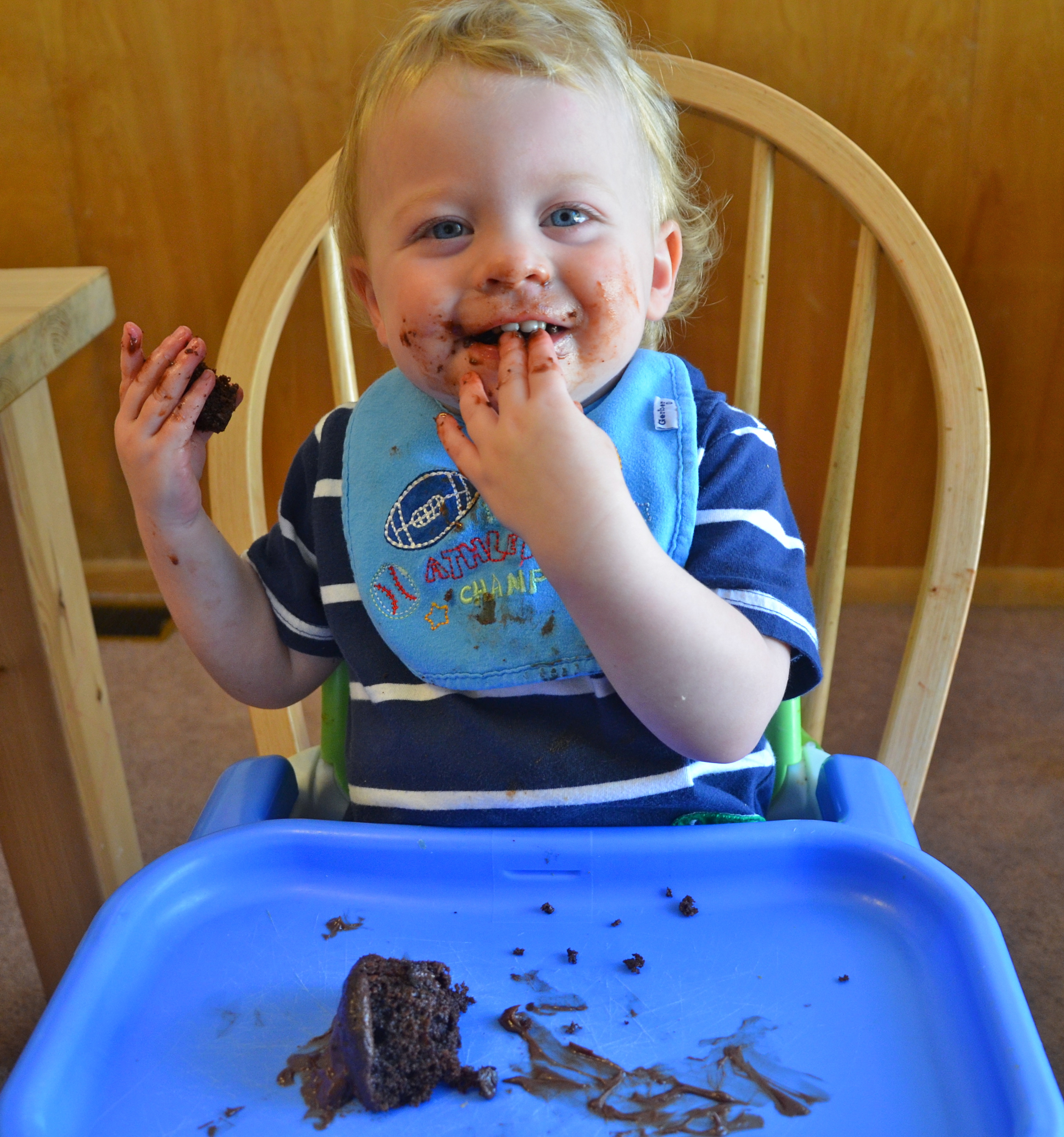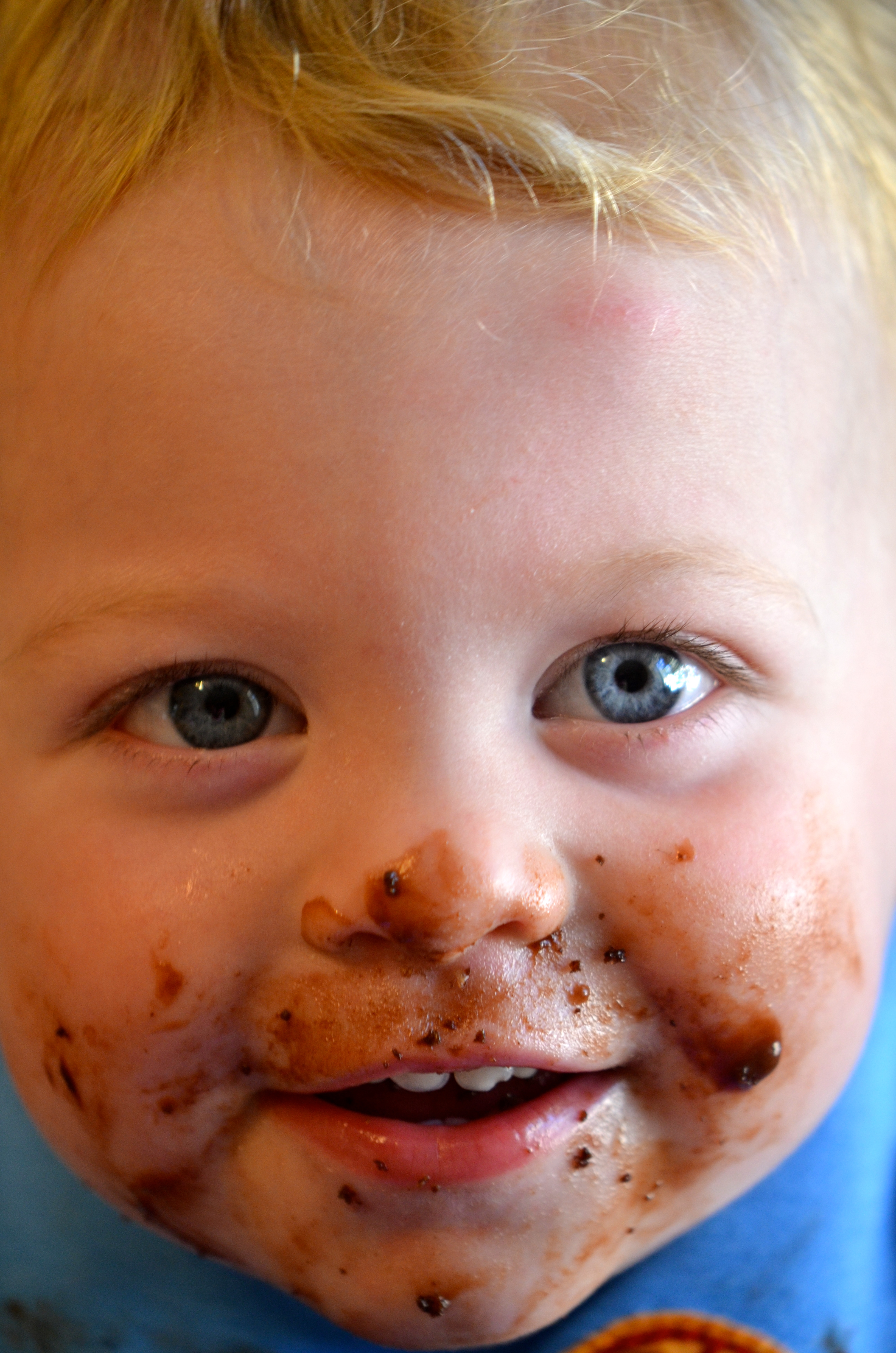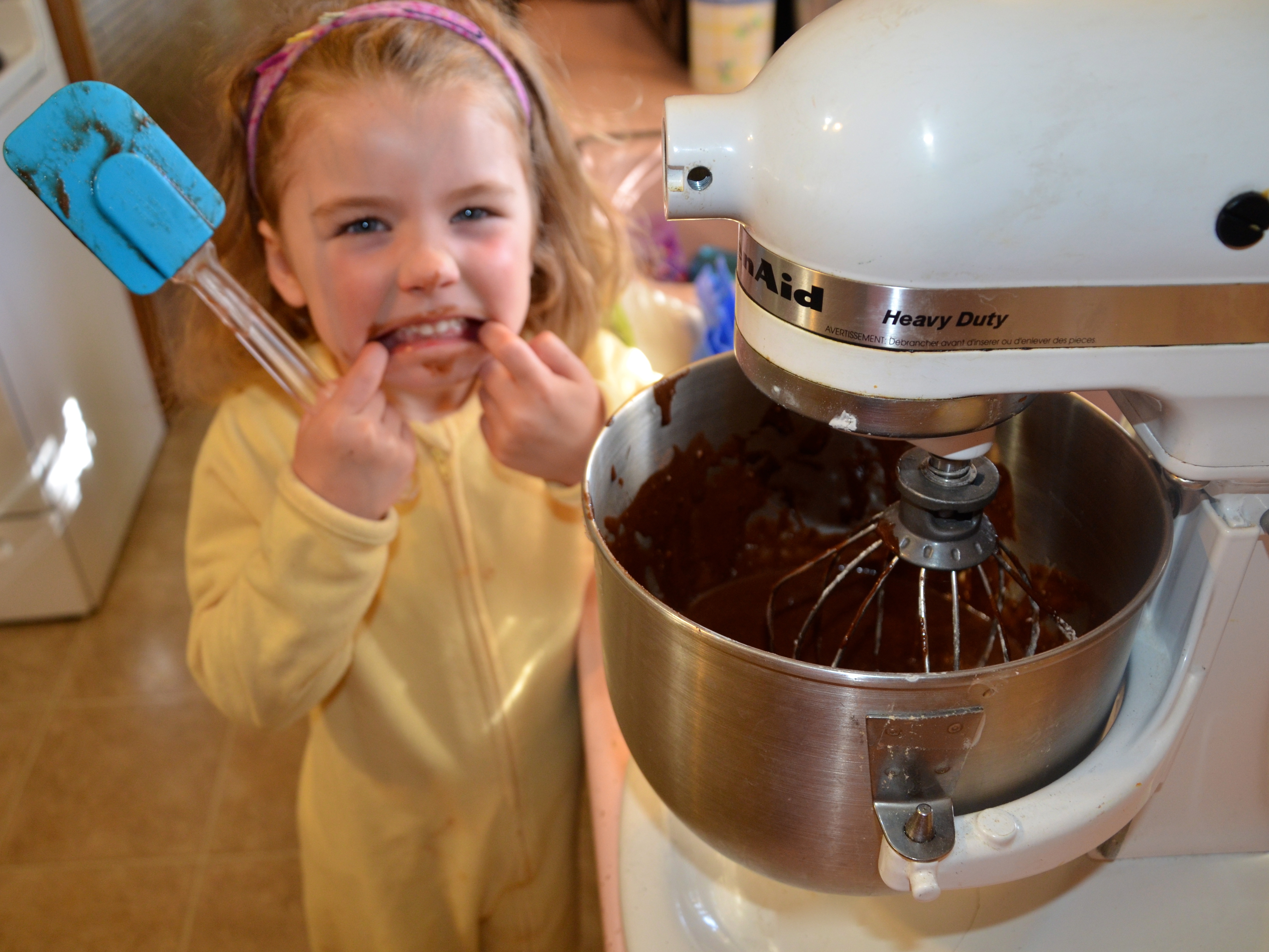 Littlest Guy foils the even distribution theory. That sneaky munchkin hones in on the glistening chocolate batter and makes his move.