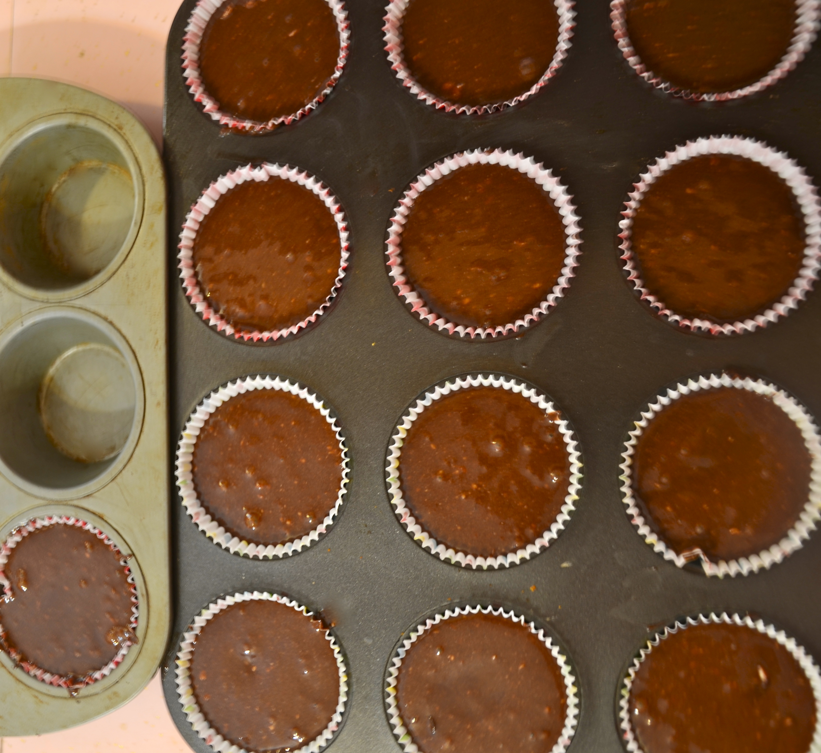 1.) Preheat oven to 350°F or 177°F. In two muffin pans, line the thirteen muffin cups. Spray muffin cups and tops of pans with cooking spray.