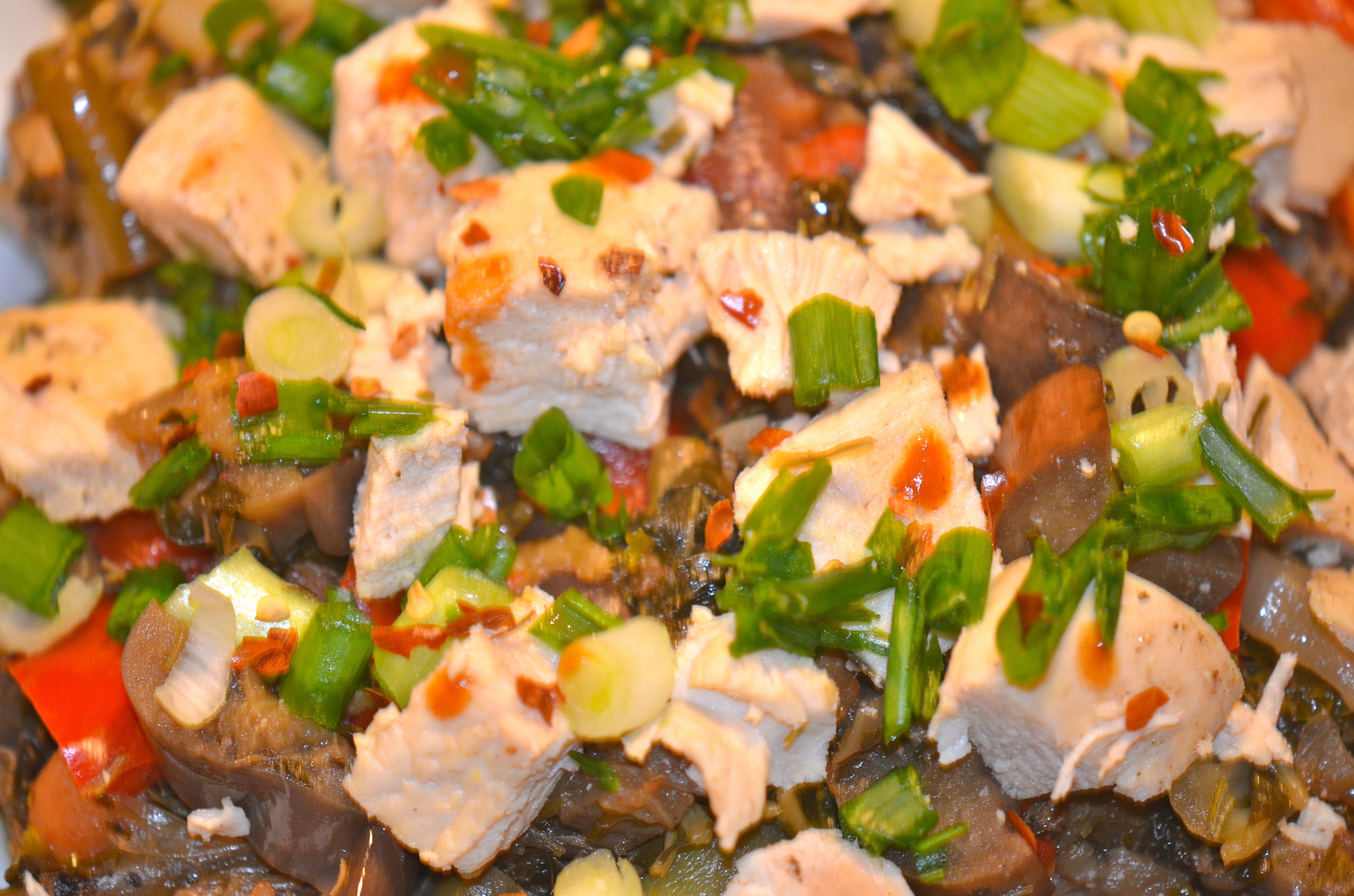 Abba Goose came home from his job at the hospital at around midnight – the OR cases were long that day – to enjoy a big, hearty bowl of stew atop steaming, fiber-rich brown rice. The dish is scrumptious topped with scallions for crunch and sriracha sauce for a spicy kick.