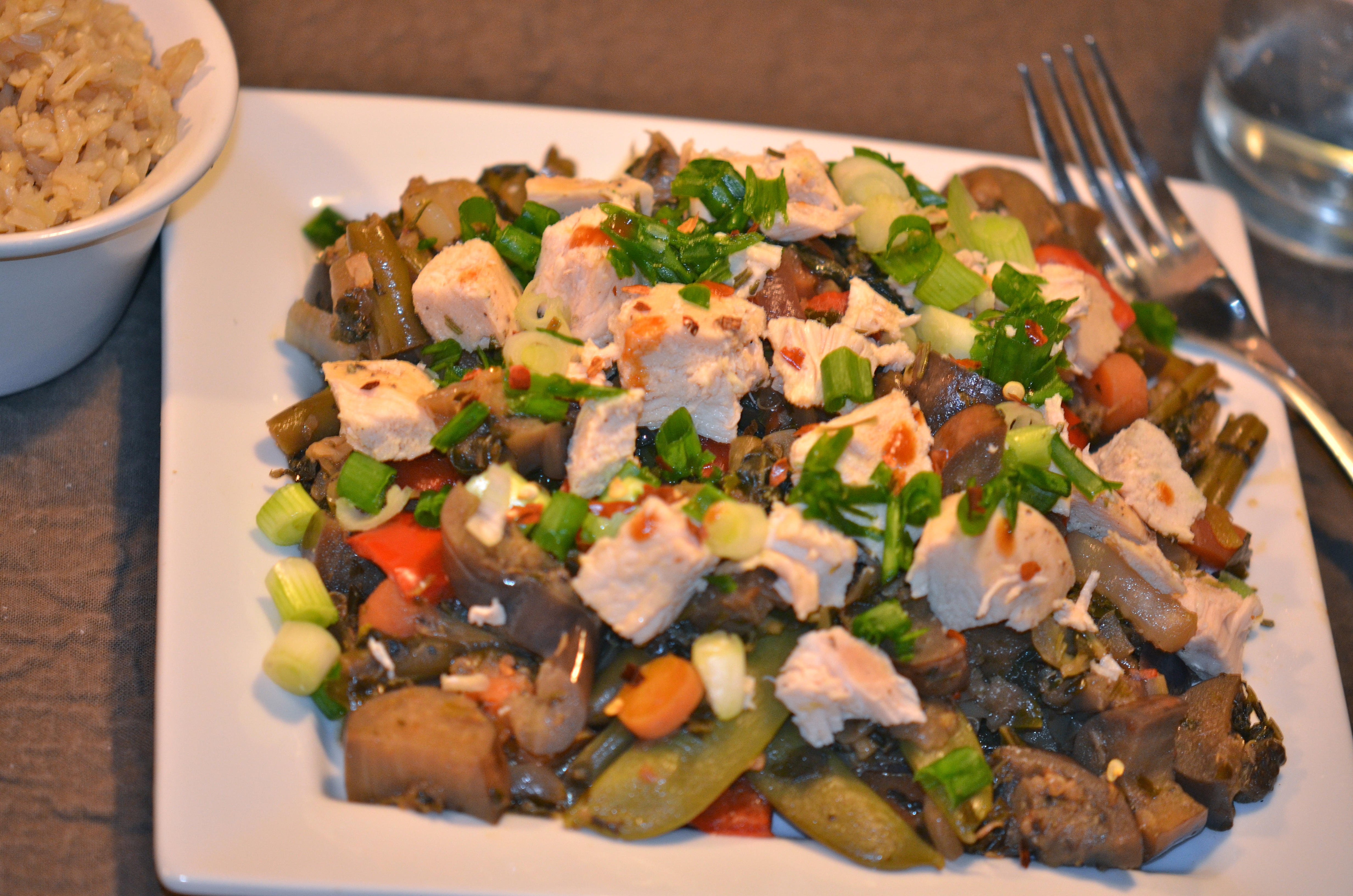 I found inspiration during yesterday’s trip to market, where a plethora of perfectly ripe, beautiful and colorful Asian vegetables called out to me. The kinder and I loaded up on deep green super-foods like leafy kale and bok choy (Chinese cabbage), along with long, thin, light purple Japanese eggplants; carrots, beans, bright green sugar snap peas; crisp, red peppers and sweet, yellow onions.
