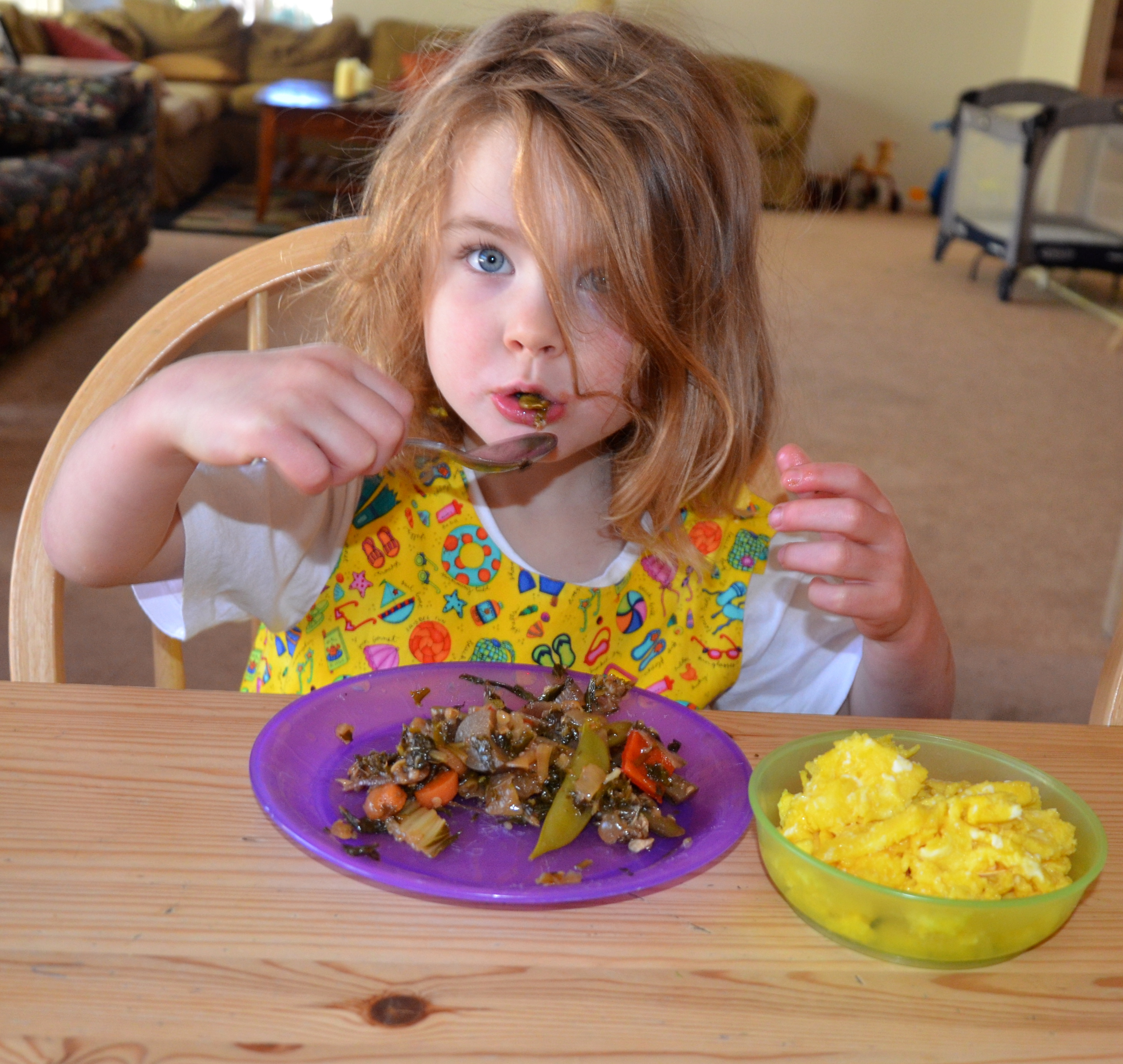 There had been need for worry – the kinder gobbled it down! “The carrots are so sweet!” said Snoo Magoo. Yes, vegetables are nature’s candy! Littlest Guy enjoyed double-fisting his bites of stew along with Thomas the Train-shaped organic, semolina pasta. Snoo Magoo requested a side of scrambled eggs. Abba Goose raises free range chickens, and their eggs are rich, flavorful and go well with any meal.