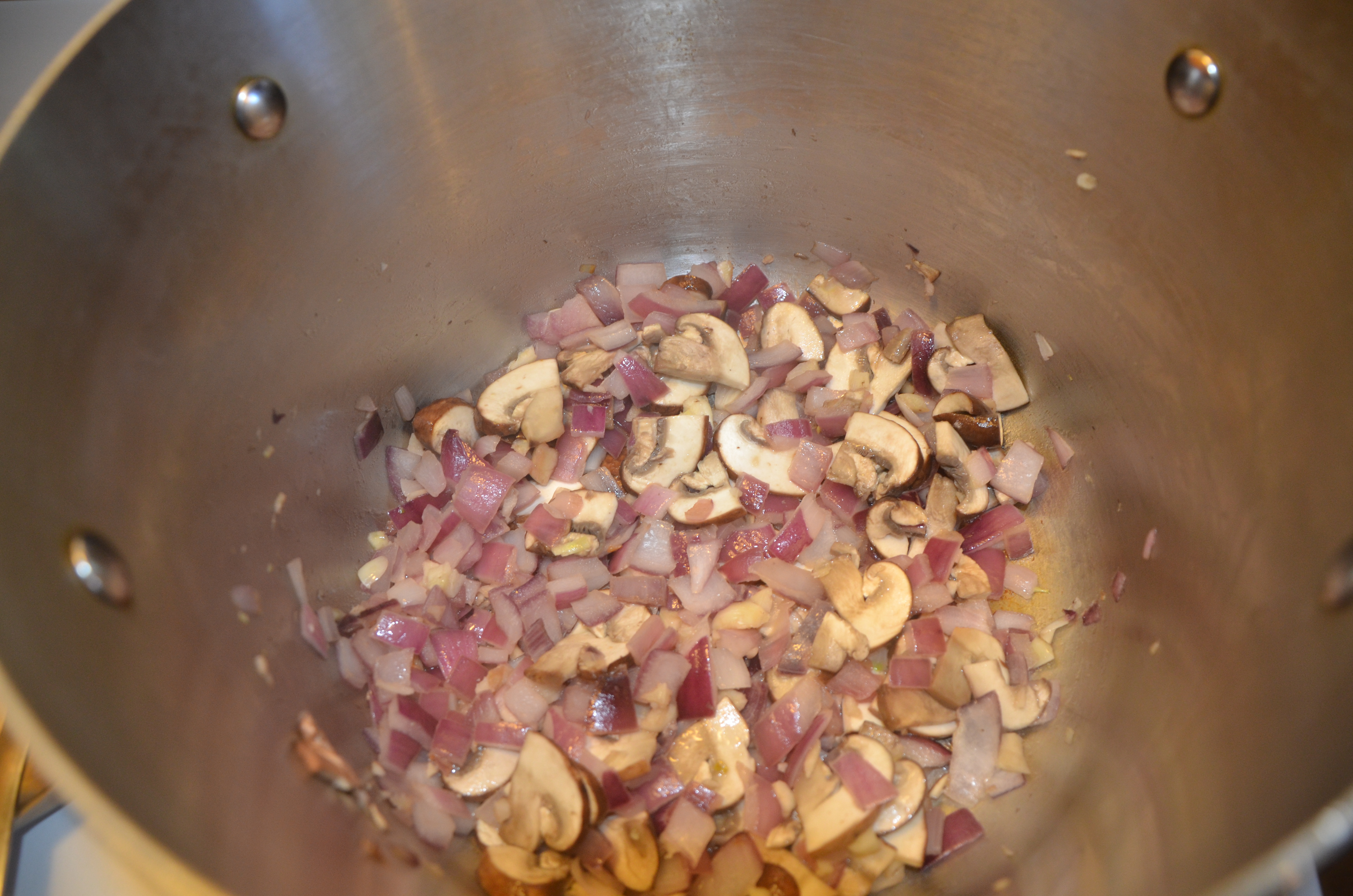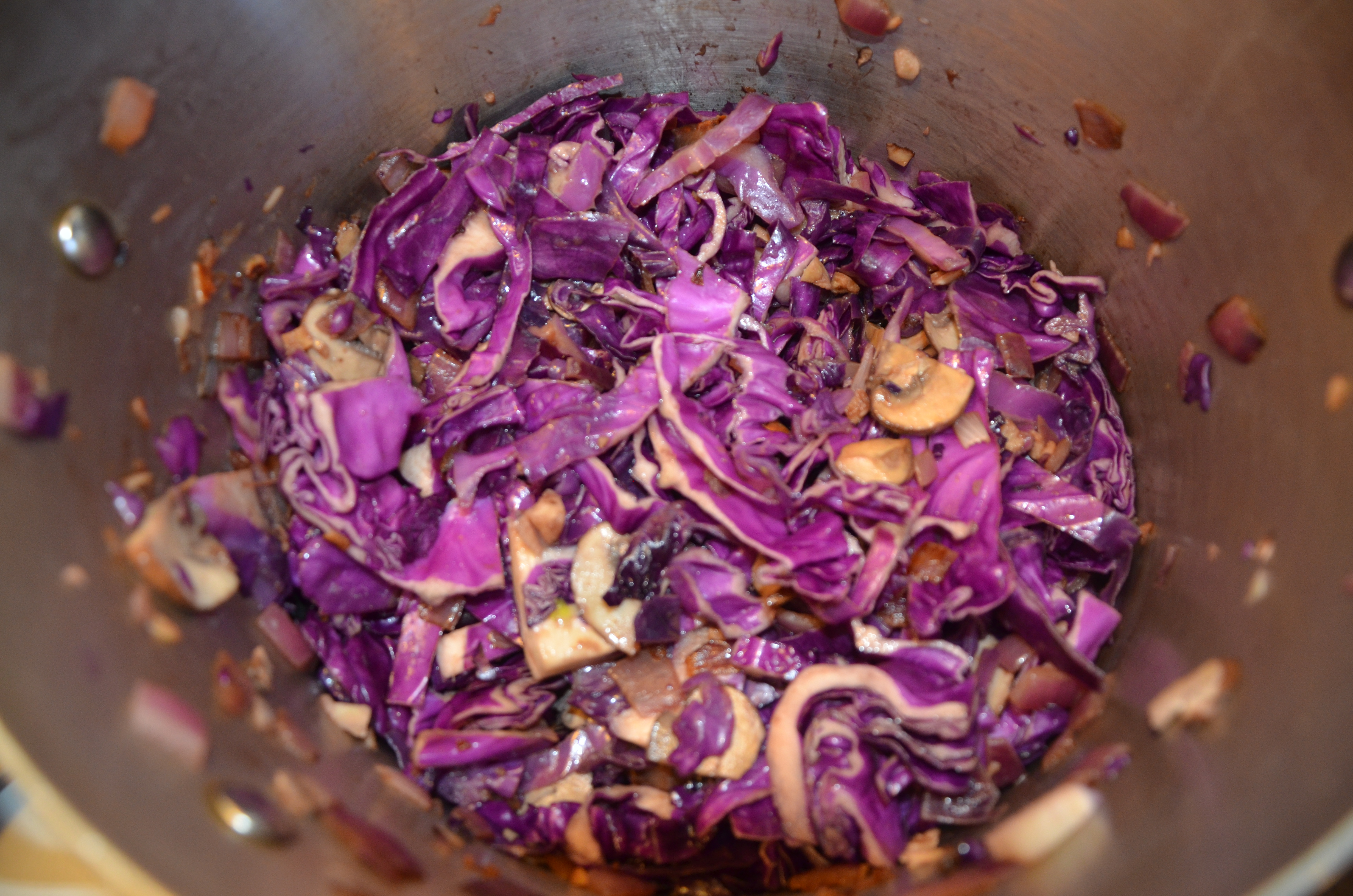 1.) Heat the olive oil in a large stock pot or dutch oven over medium heat. Sauté the onion and mushrooms until the mushrooms are golden the onion translucent. Add the garlic and sauté the mixture one minute more, just until fragrant. Stir in the purple cabbage and sauté a few minutes until it is tender-crisp. Season with salt and pepper.