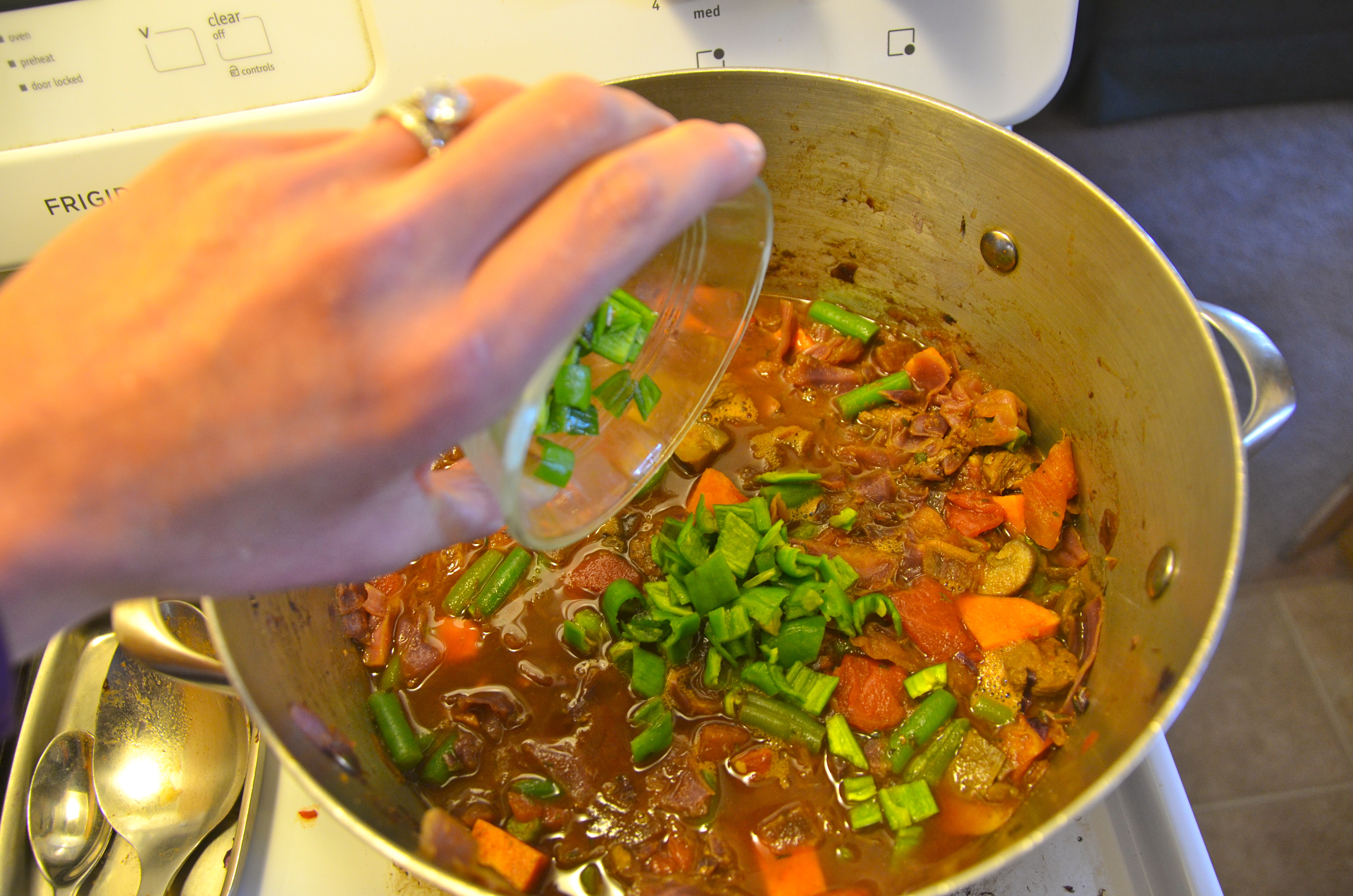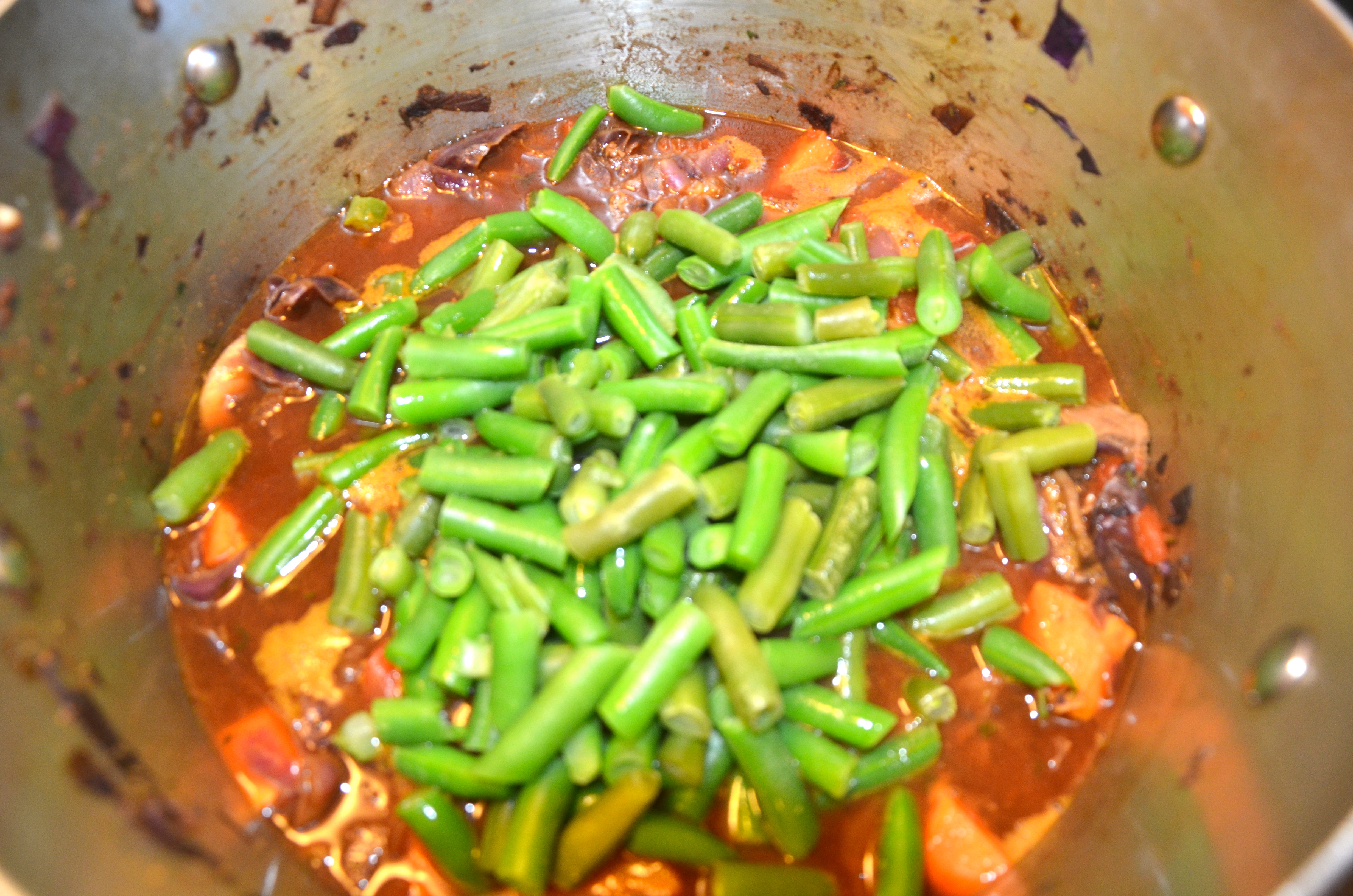 3.) Add the green beans, tomatoes, chicken stock and chiles. Reduce heat to low and cover. Allow the stew to gently simmer for two hours, or up to four hours, stirring occasionally. When ready to serve, taste and re-season with additional salt and pepper. Garnish bowls of stew with fresh parsley. Enjoy!