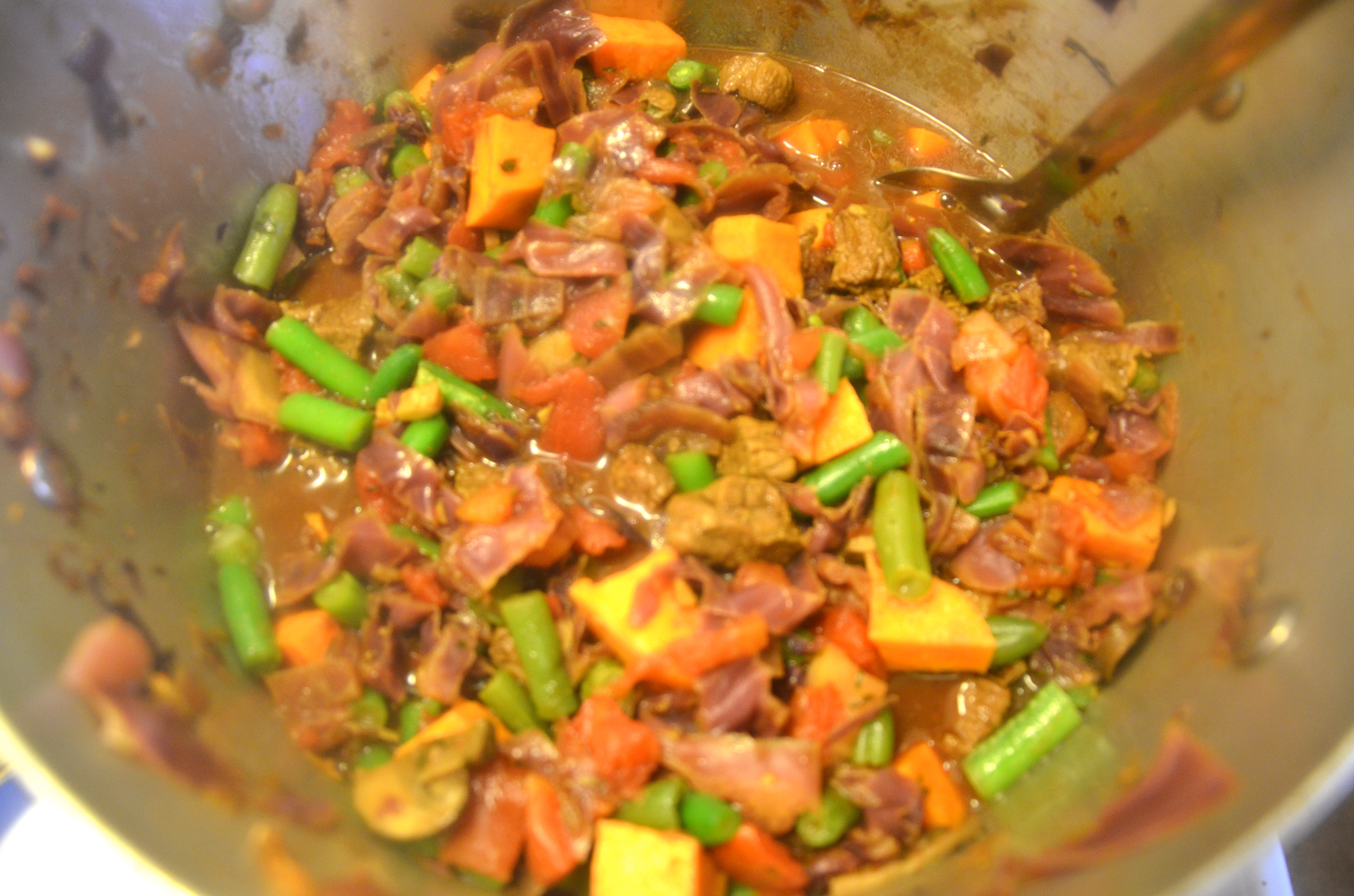 2.) Add the lamb stew meat to the pot and sauté the lamb just until it is browned. Season again with salt and pepper, according to taste preference. The chicken stock and tomatoes in the recipe will have add a bit of salt. Next, add the sweet potato and the spices; stir to combine.