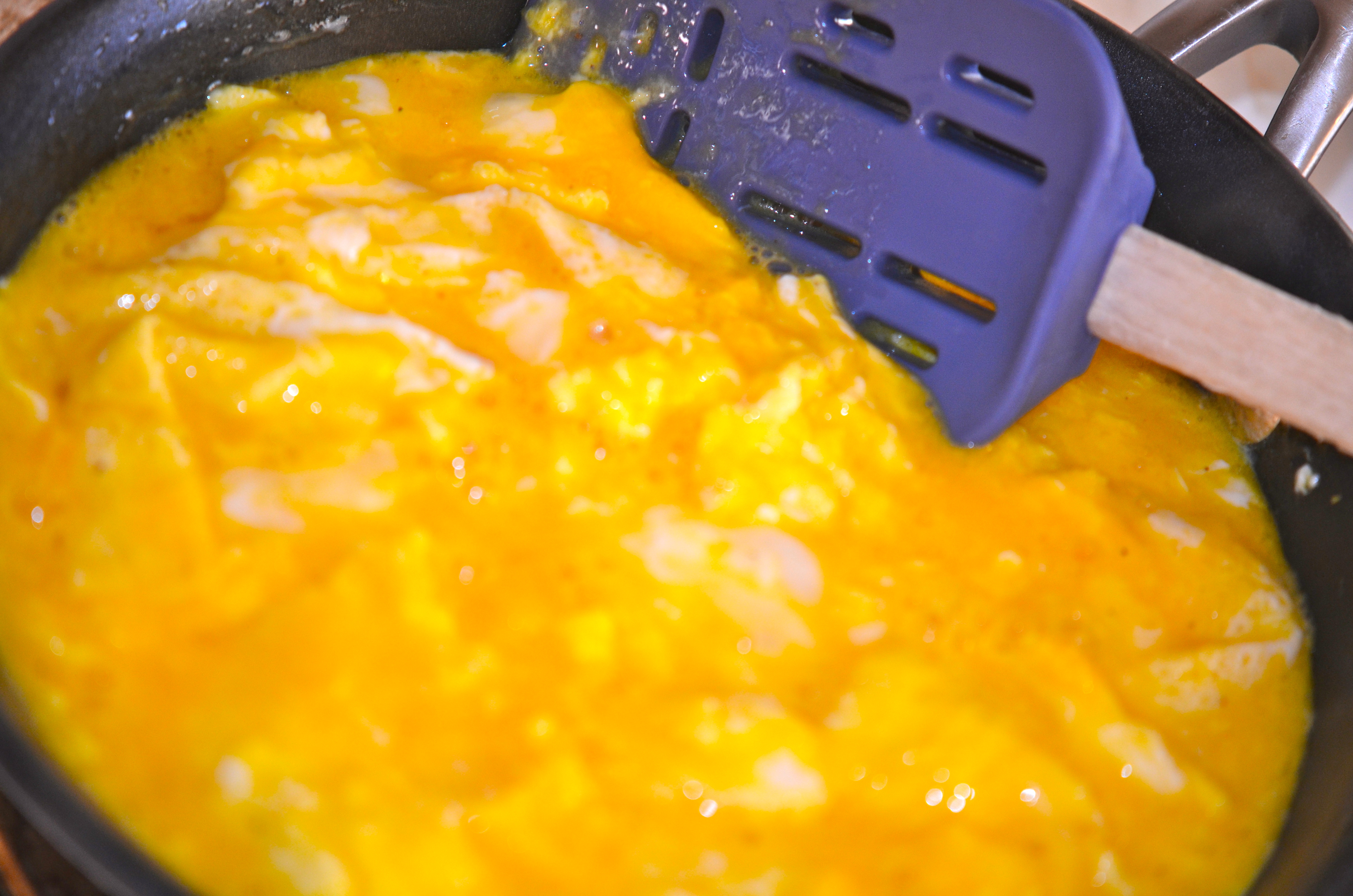 2.) Place the butter and garlic oil in a frying or cast iron pan over low heat. Swirl the pan until they are melted. Add the eggs and cook over low heat until cooked through, stirring them with a spatula every minute or so.