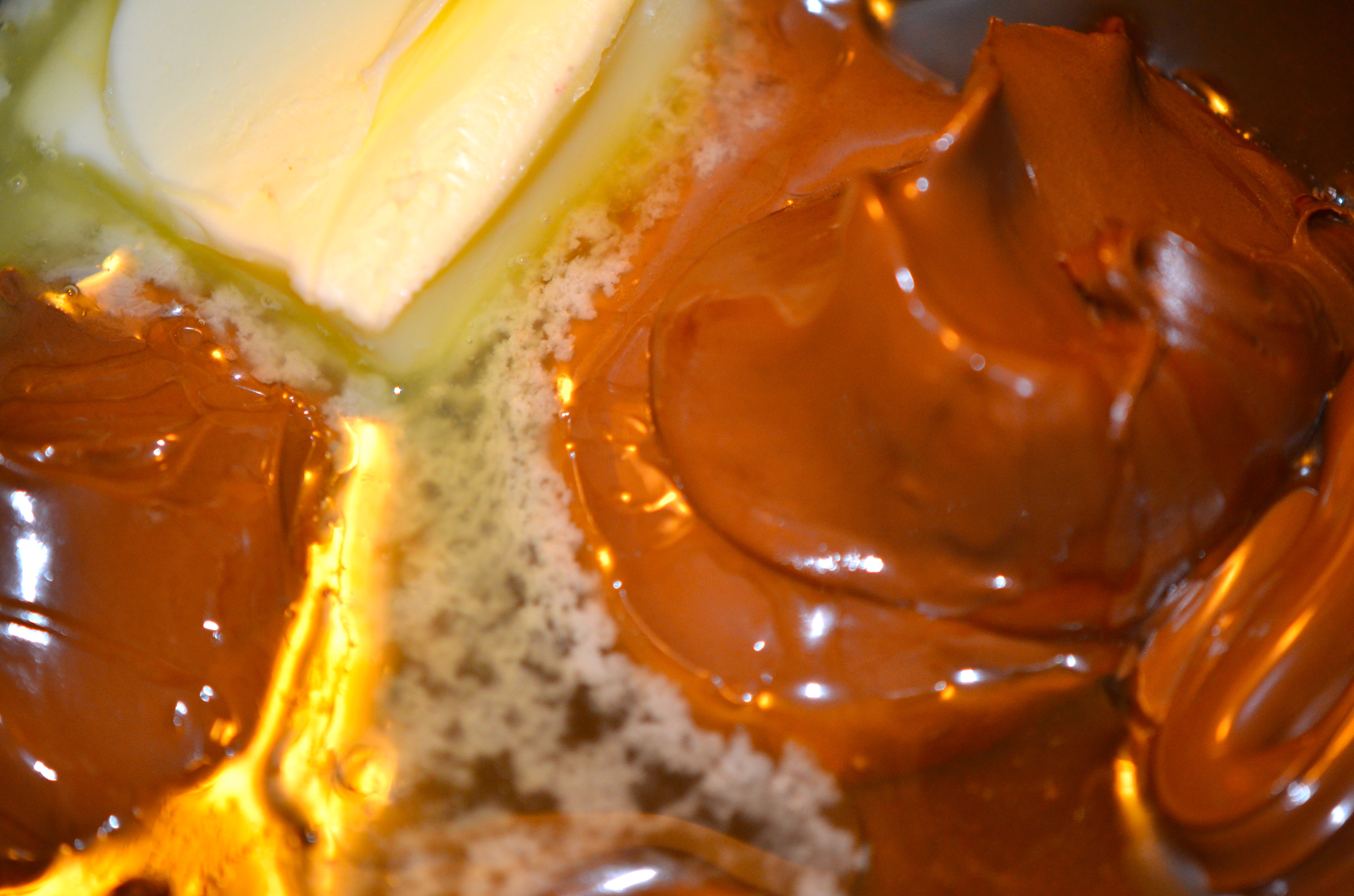 Then, melt the chocolate-hazelnut spread, butter and honey over low-heat.