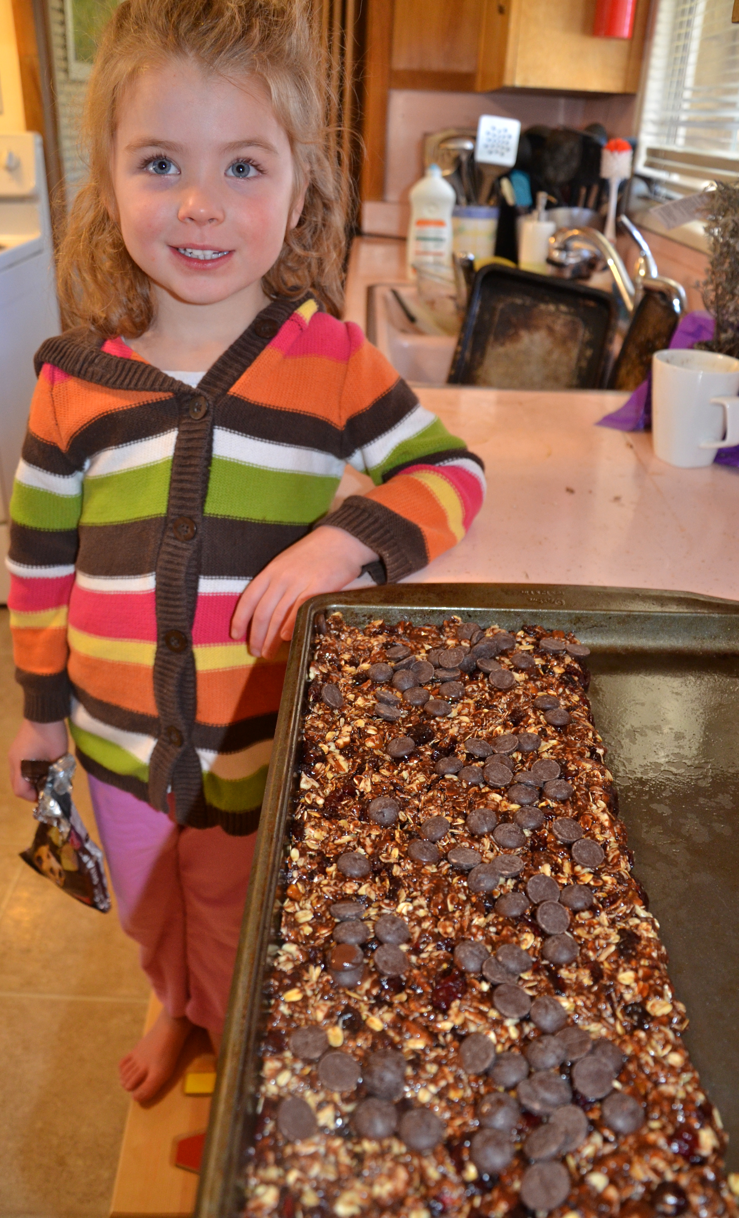 This morning, all of the ingredients in Ada’s recipe were assembled on the counter. My daughter, Snu Magoo, came in the kitchen to help bake – she loves to cook with  me, “Ima.” She promptly requested, “Can we make these granola bars chocolate bars? Really chocolatey? Please?!” A girl after my own heart.