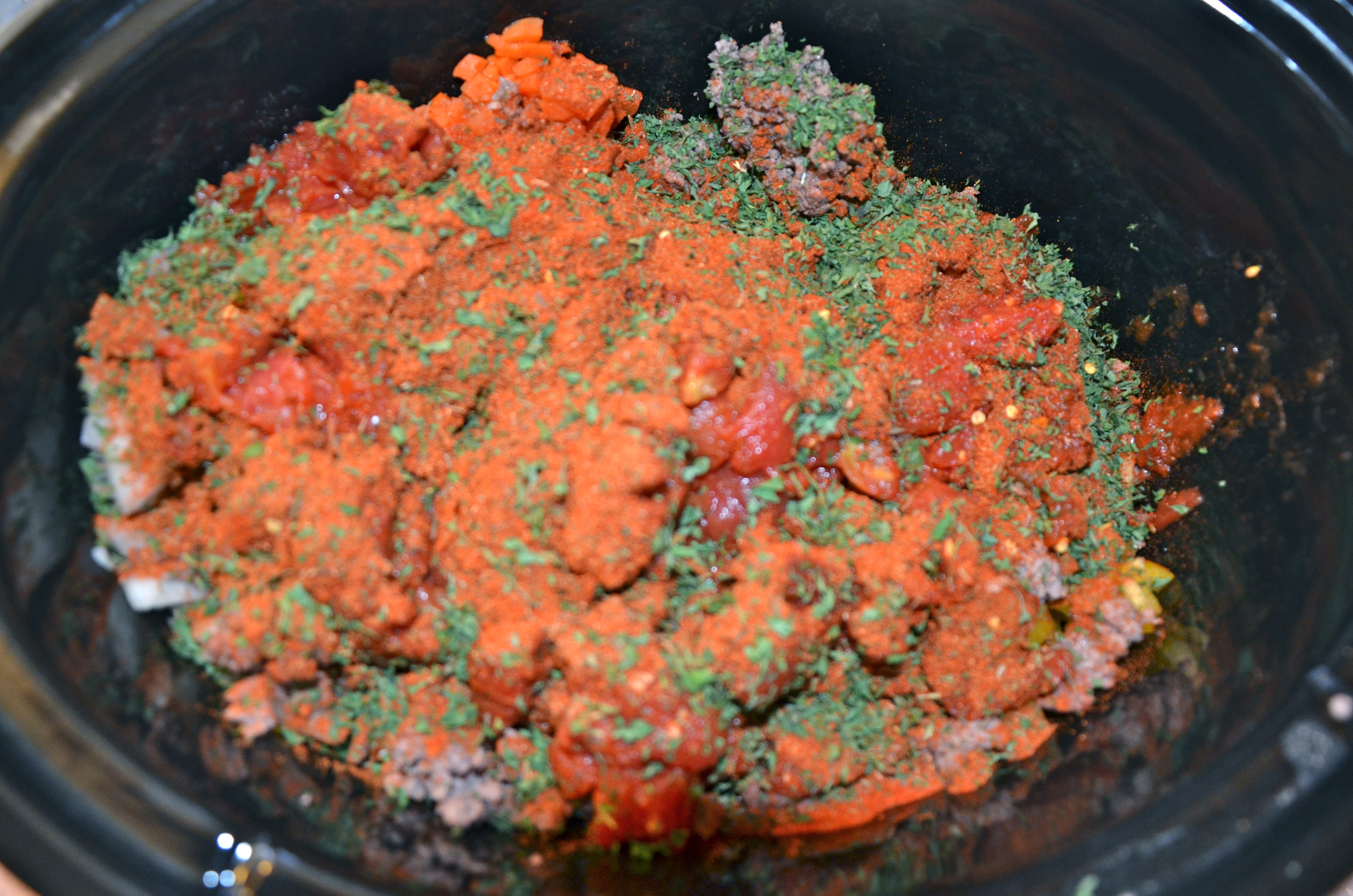 First, place the vegetables in the slow-cooker. Oh, salubrious and colorful produce!