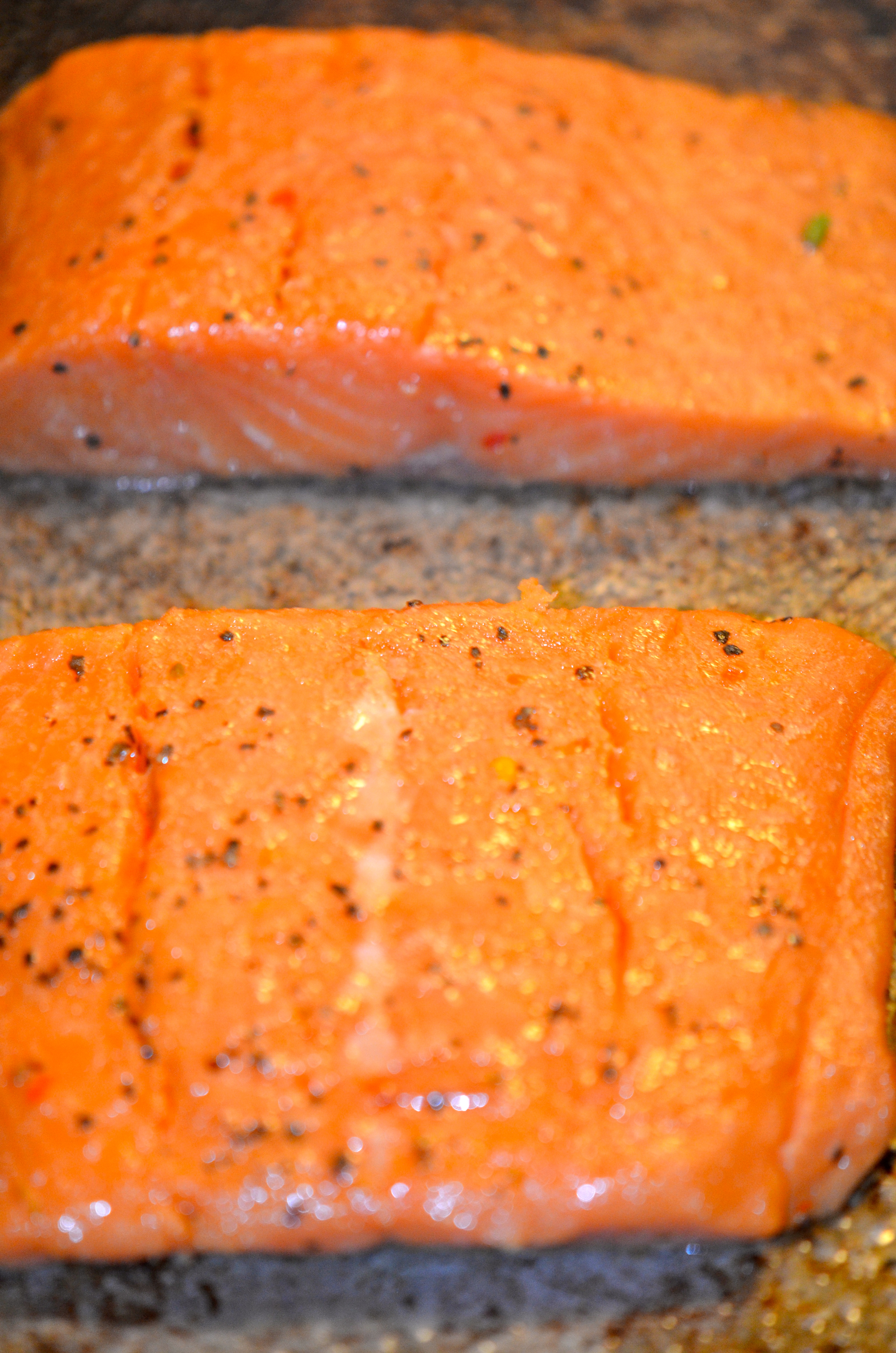 - Bake the salmon for last 10 minutes of the vegetables’ cook time.