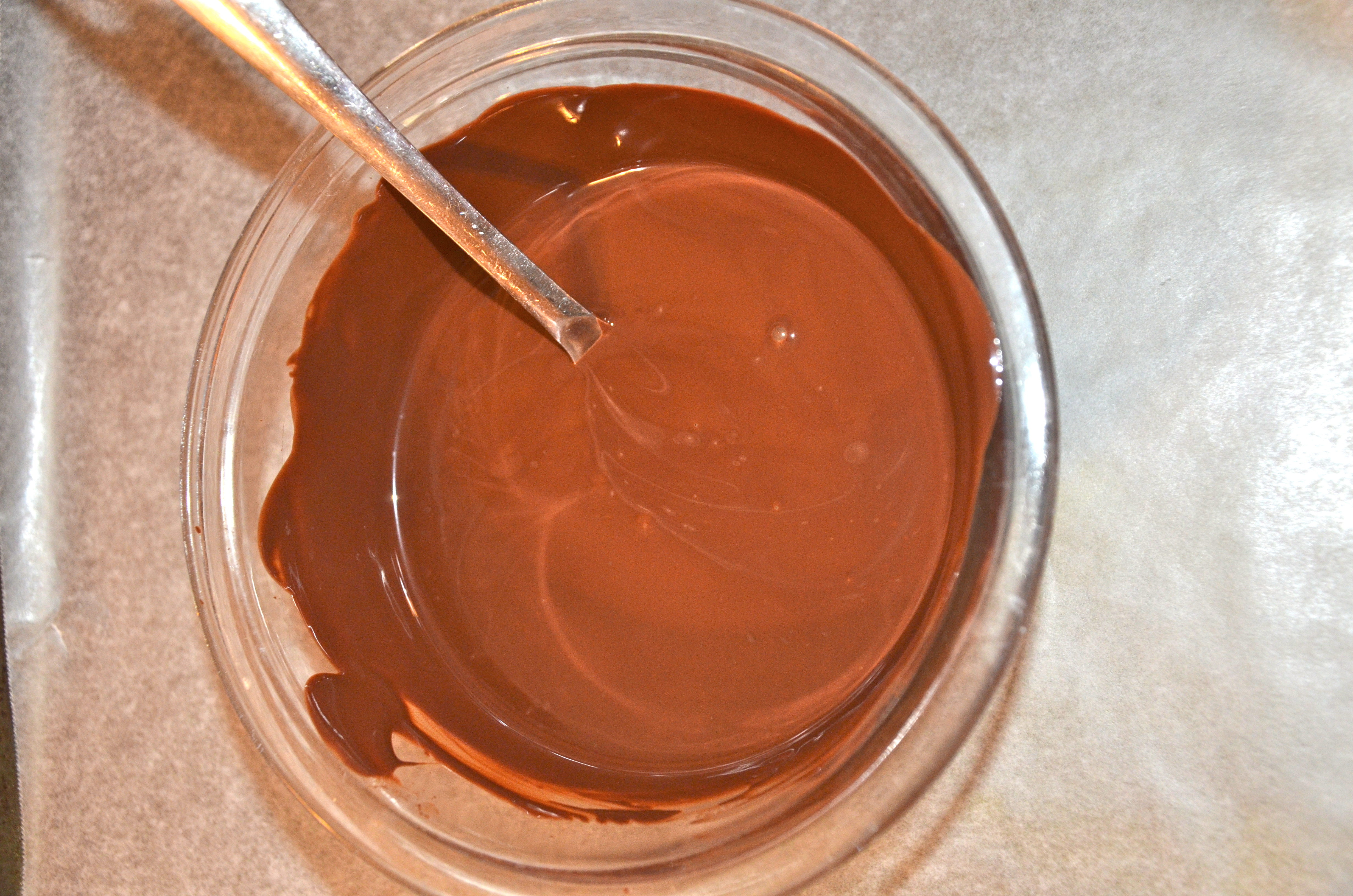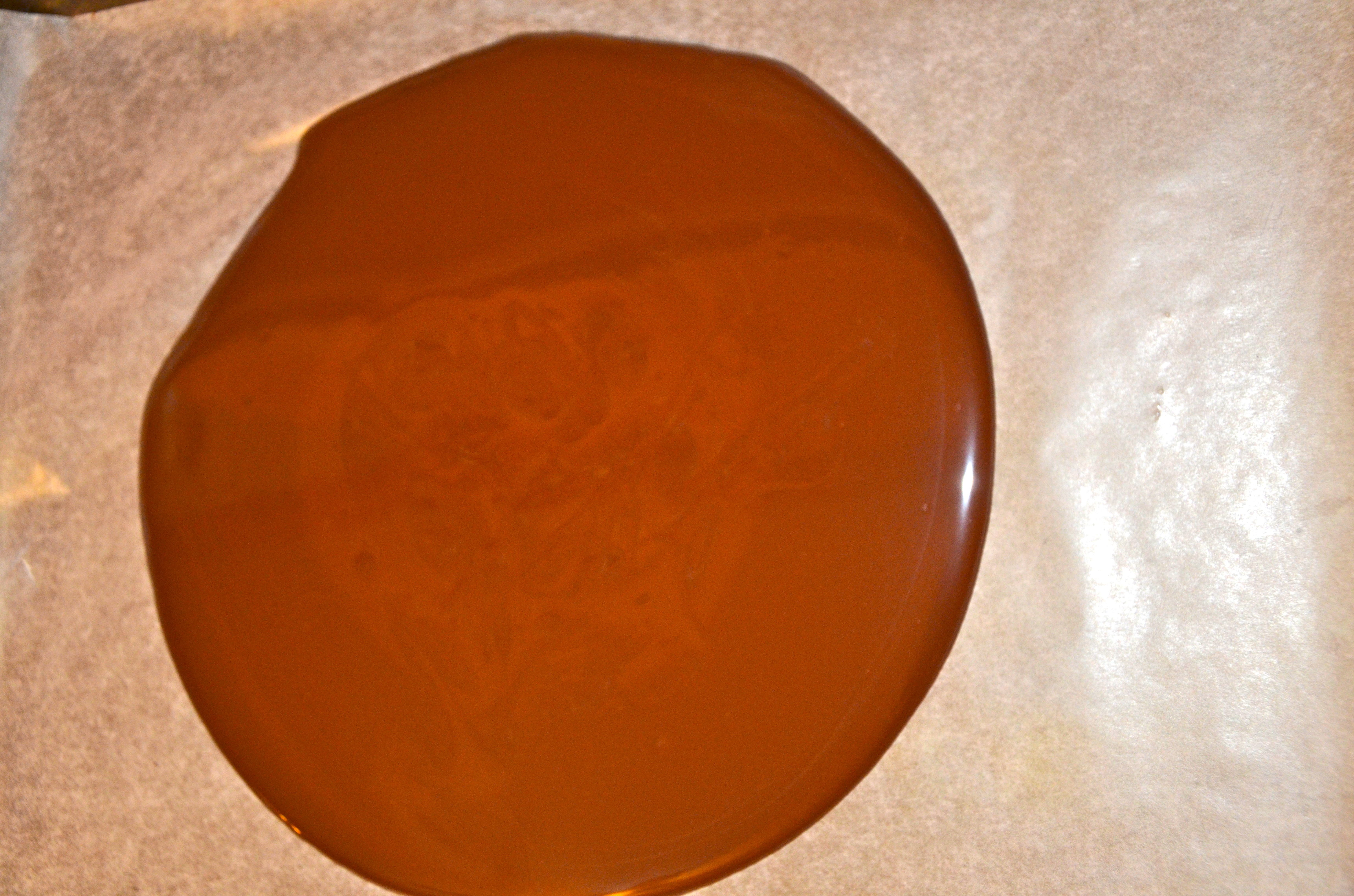 • Pour the tempered dark chocolate onto the wax paper.