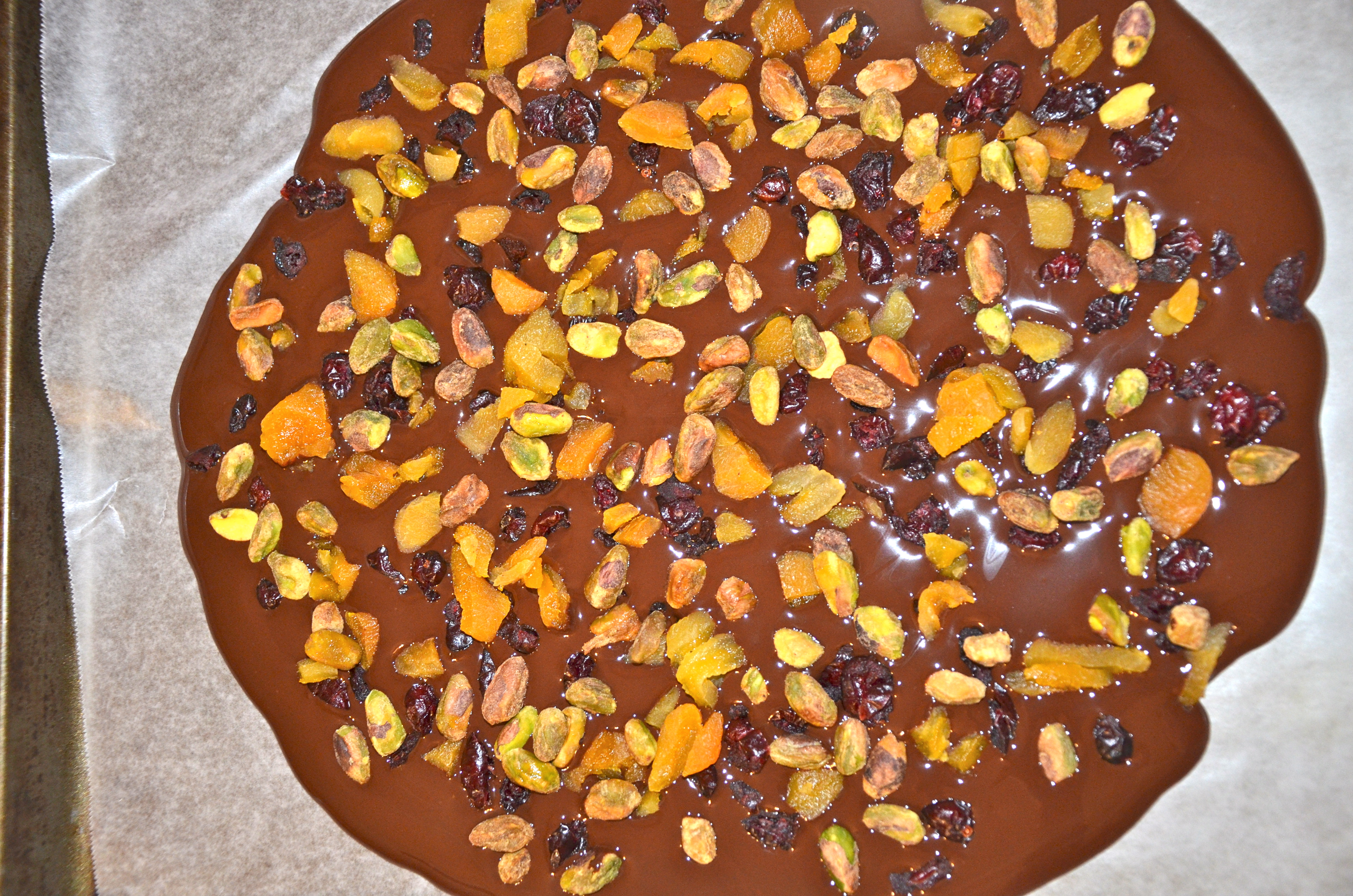 • Sprinkle all toppings, except the cherries, onto the dark chocolate.