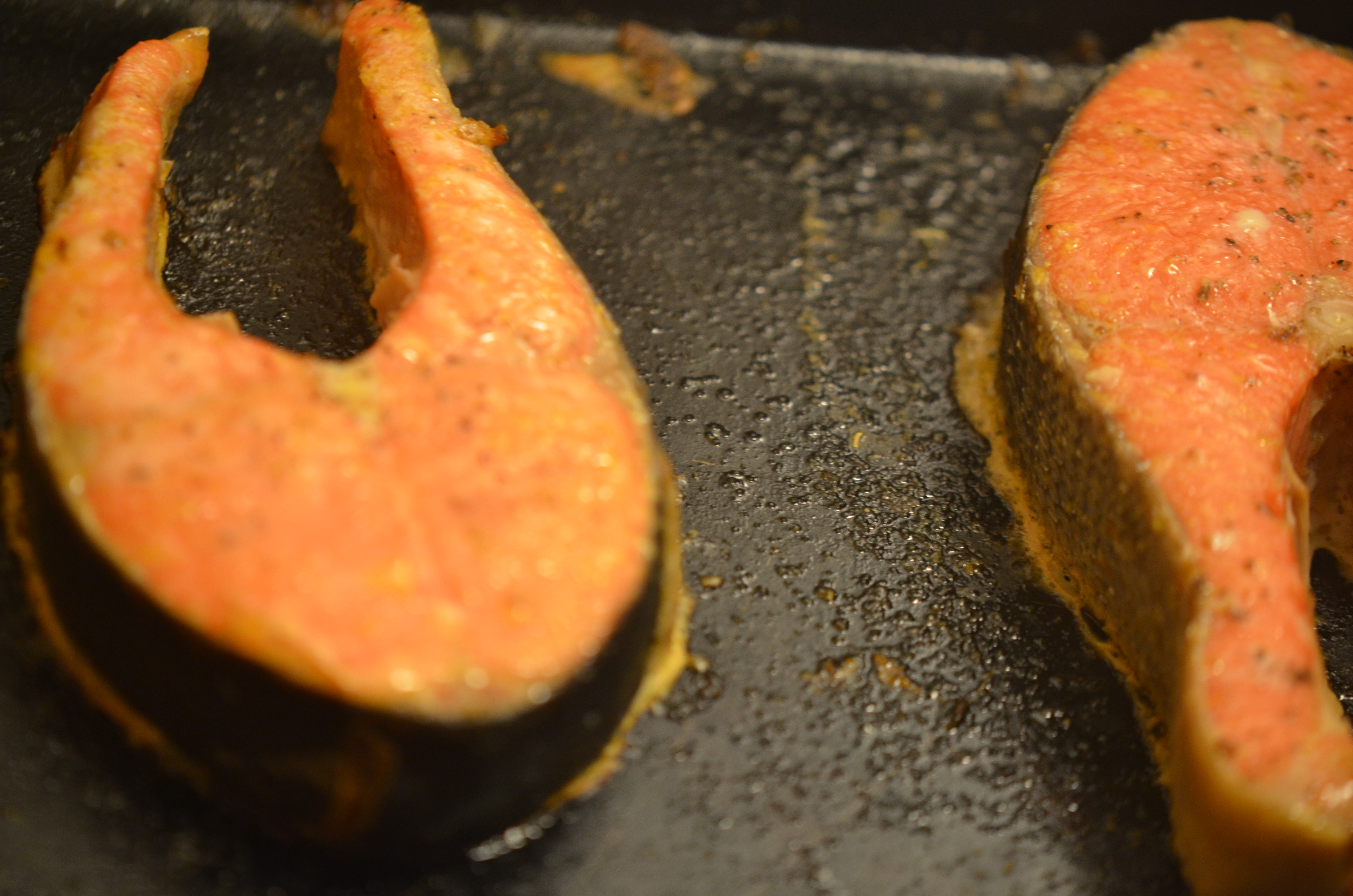 DSC_1713The salmon roasts at the same temperature – and for an equal amount of time (ten minutes) – as the pumpkin and seeds.