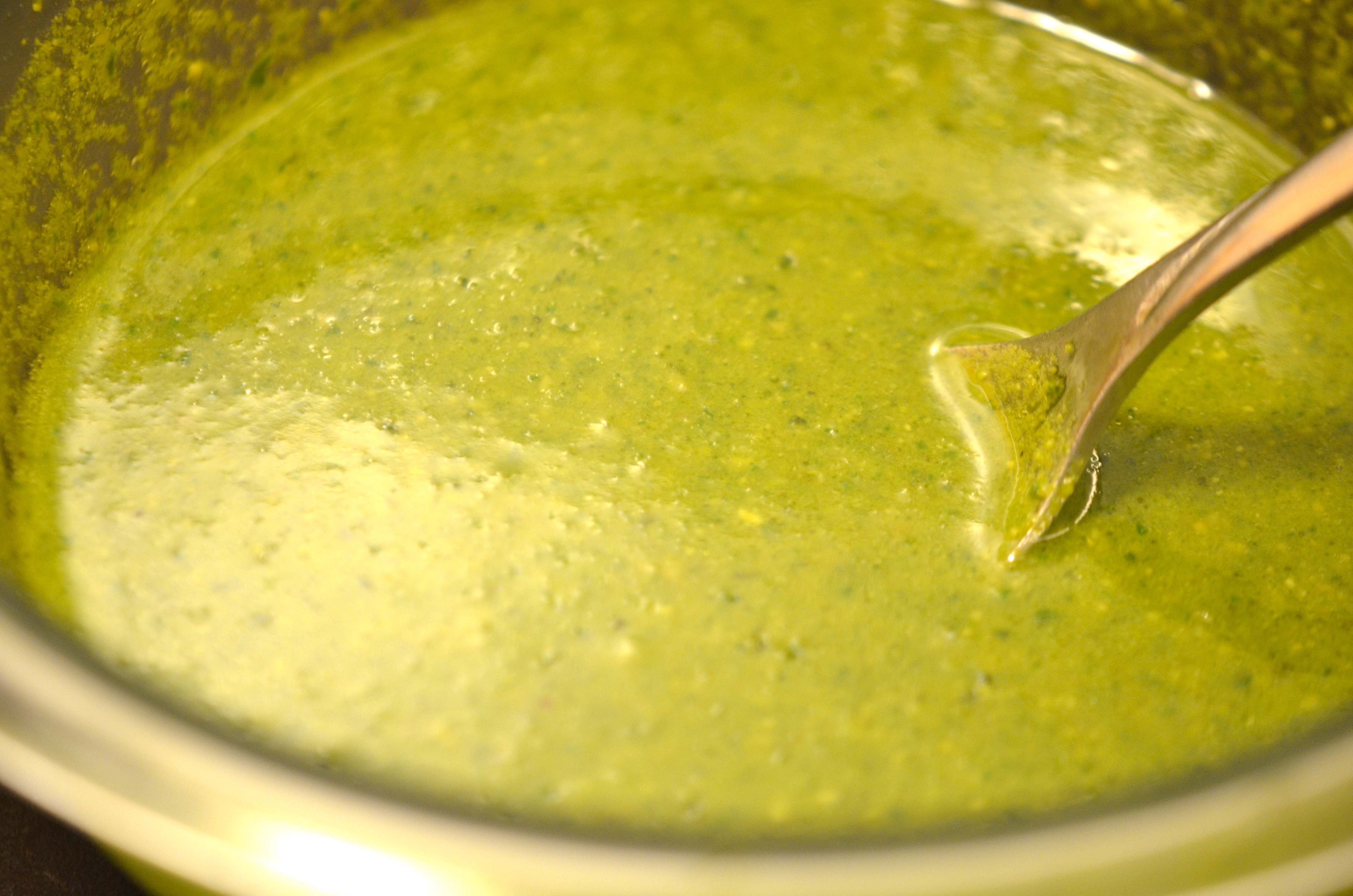 The pesto should be thin enough to drizzle over the pasta – but not too diluted.