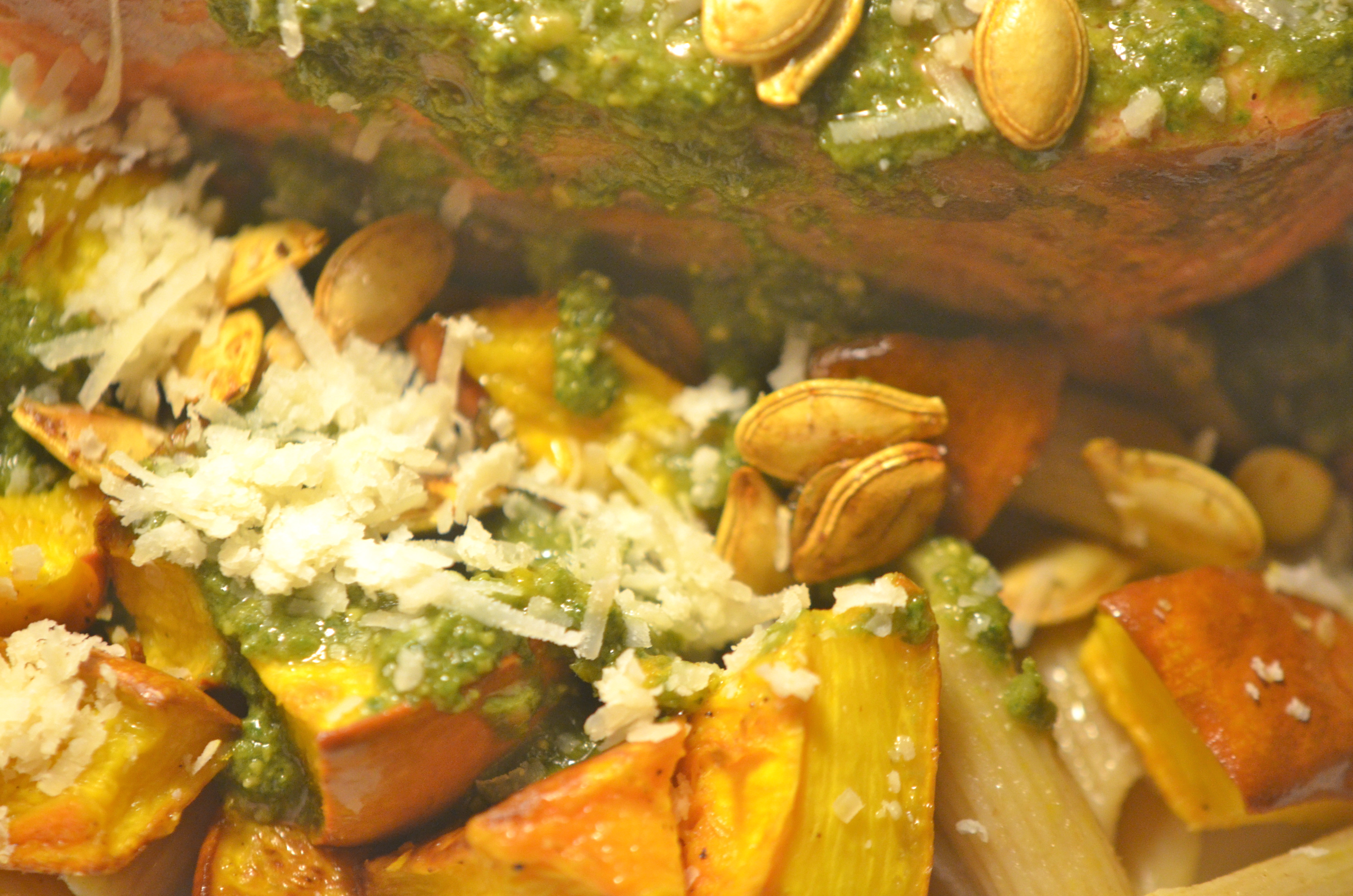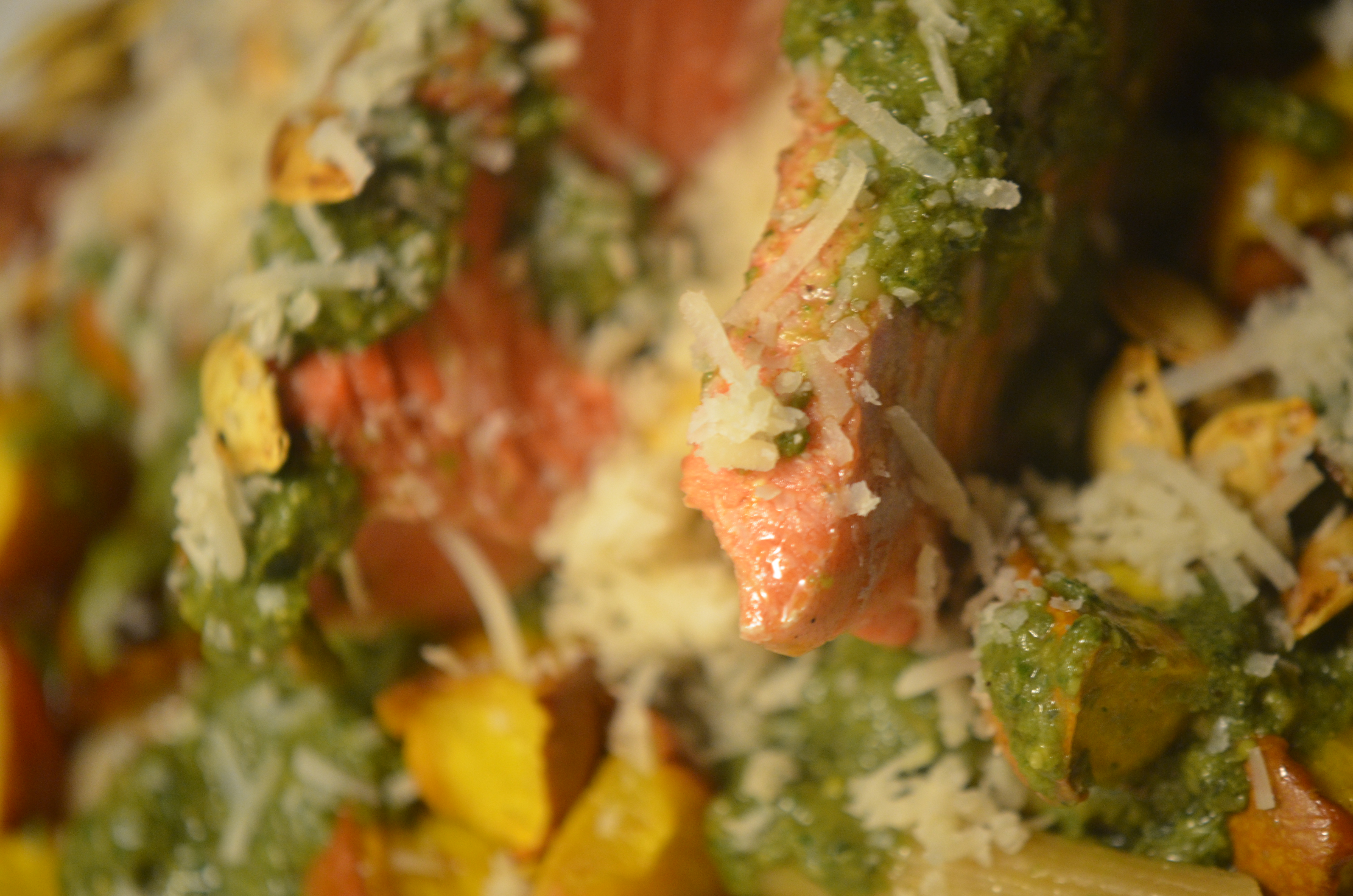 DSC_1728Crispy seeds, al dente pasta, herb-filled pesto, rich salmon, savory cheese, soft pumpkin: a win-win for us both! Leftovers fare for a luscious lunch the next day.