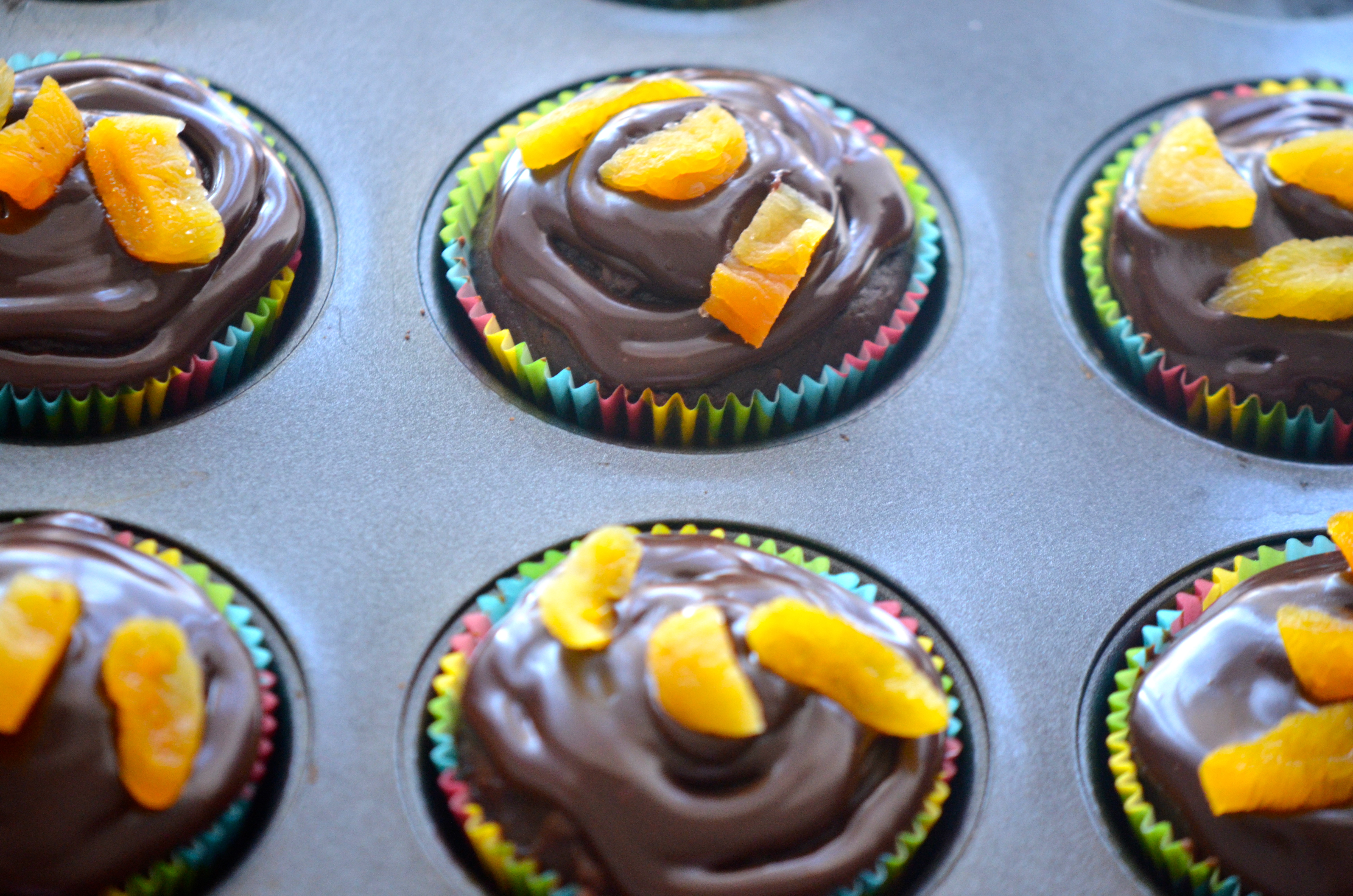 - Using a piping bag, pipe the cooled, melted chocolate onto the cupcakes. Garnish each cupcake with three apricot slices.