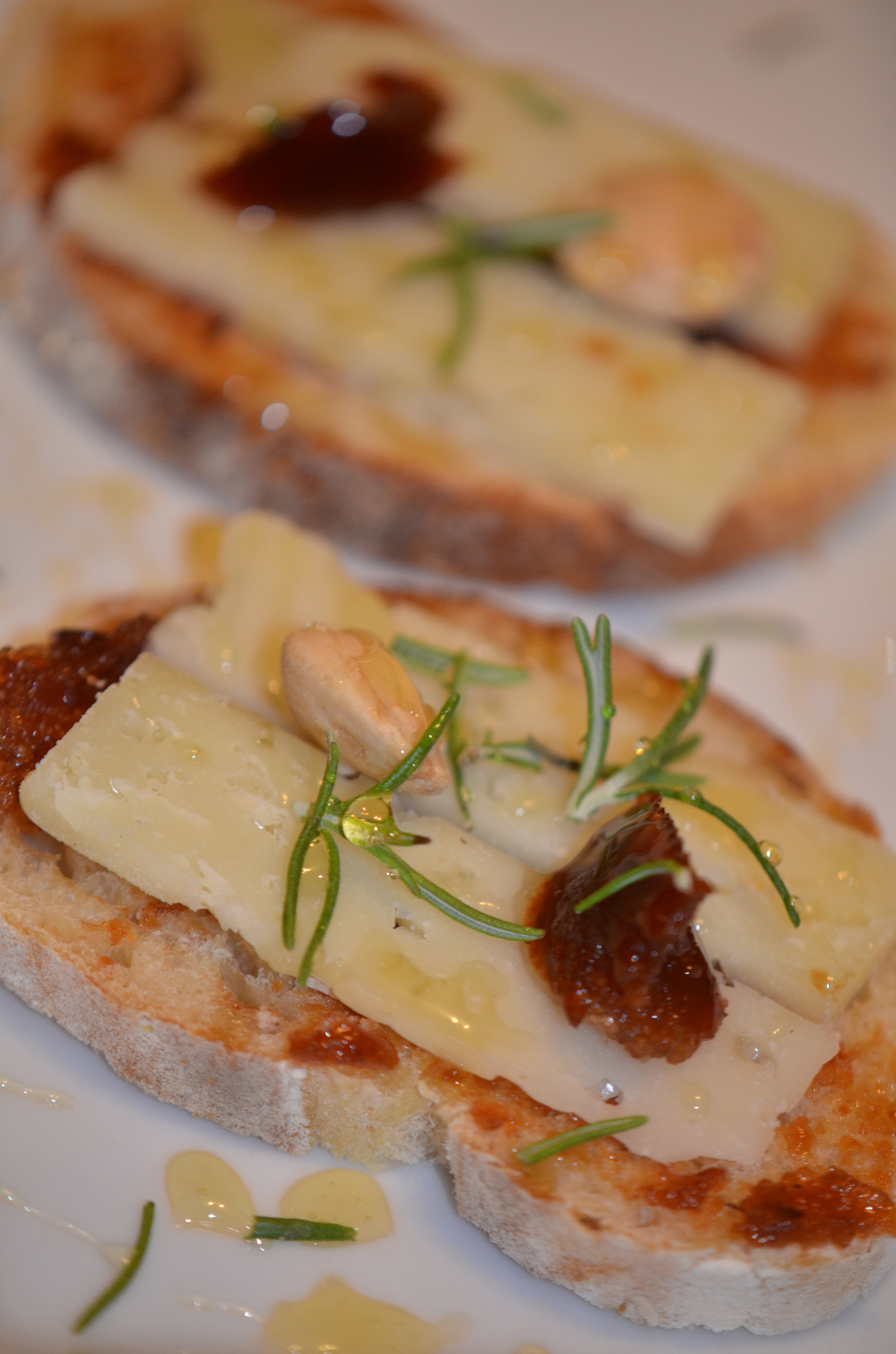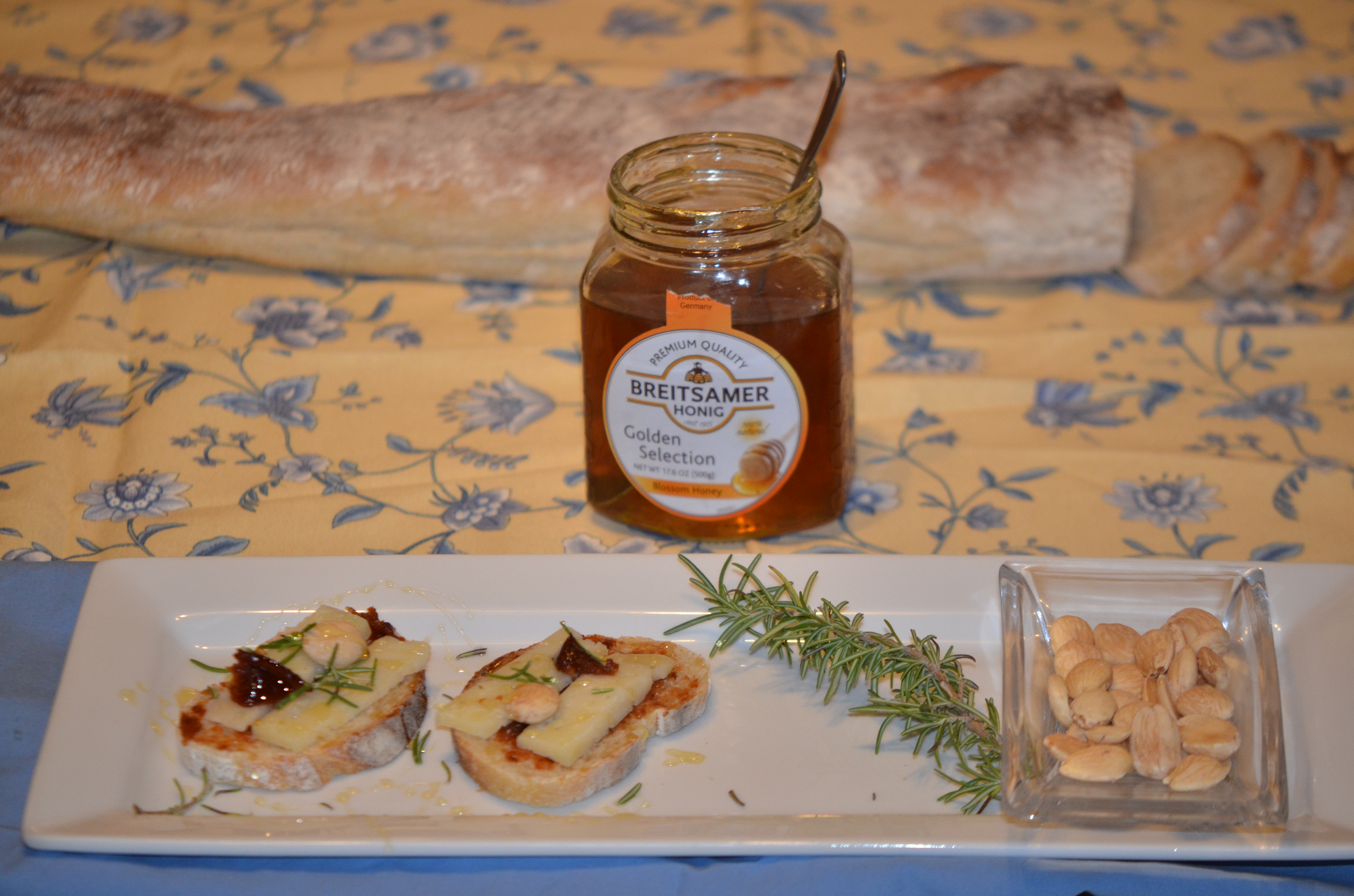 • Top the bread with slices of Manchego and Marcona almonds.