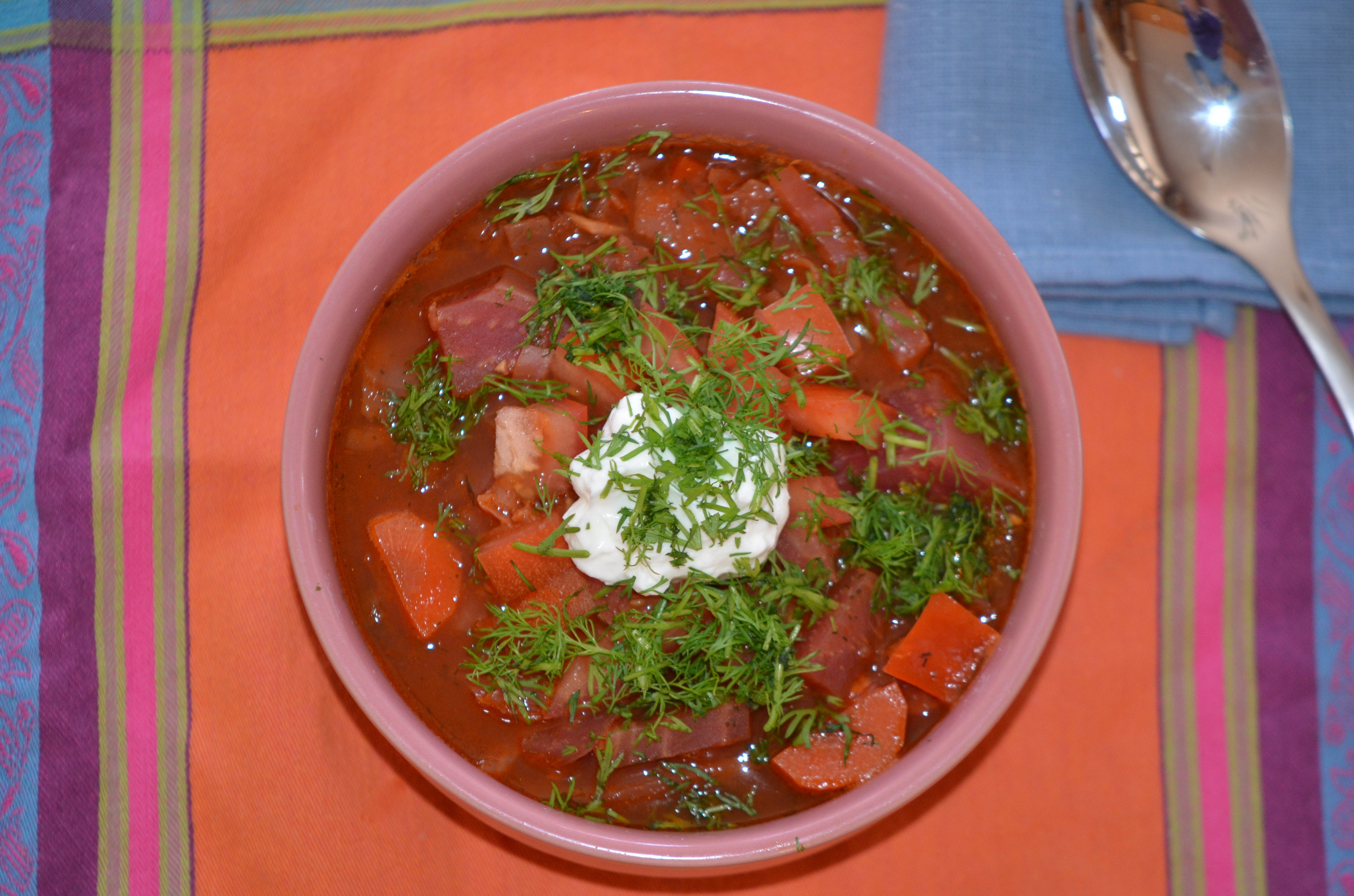 Rainbow borscht. Perfect for the opening of the Winter Olympics in Russia. Borscht seems like an ideal soup to slurp during the Games. It is hearty, healthy and hot; just ideal for the winter months. DSC_2487