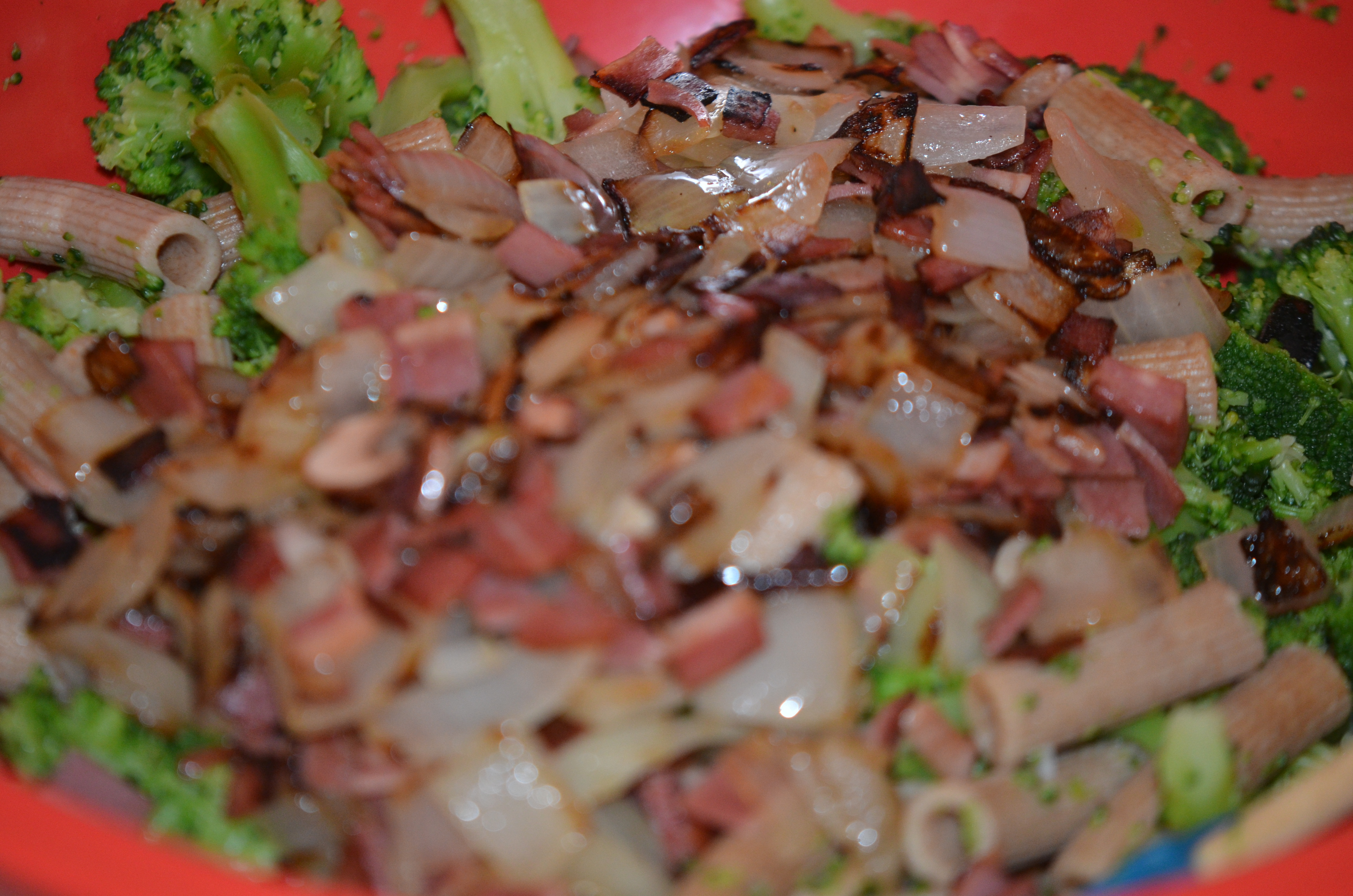 DSC_2916 April 11, 2014 • 4928 × 3264 • Two Birthday-Worthy Dishes Mix Pasta, Vegetables and Turkey Bacon.