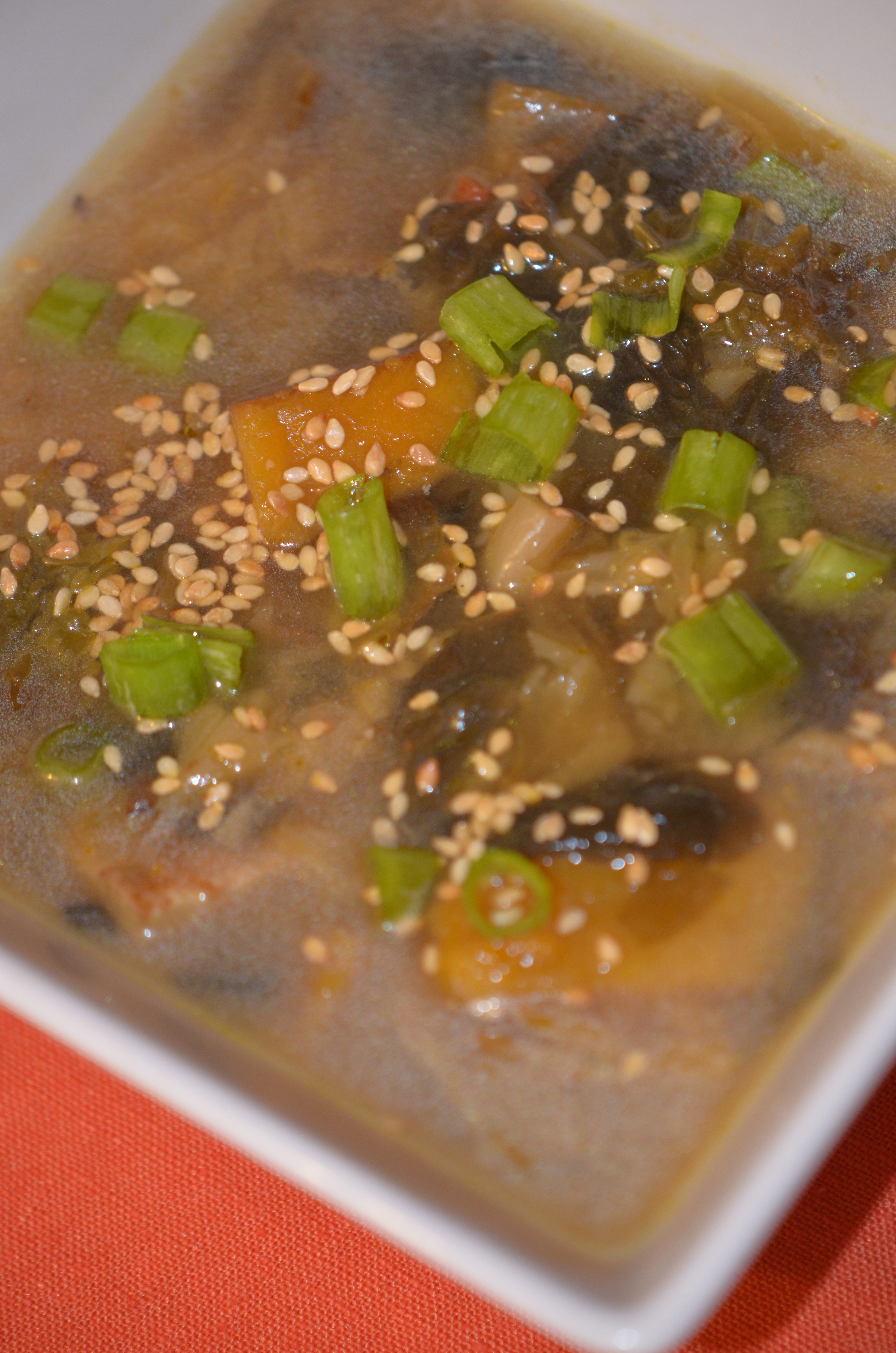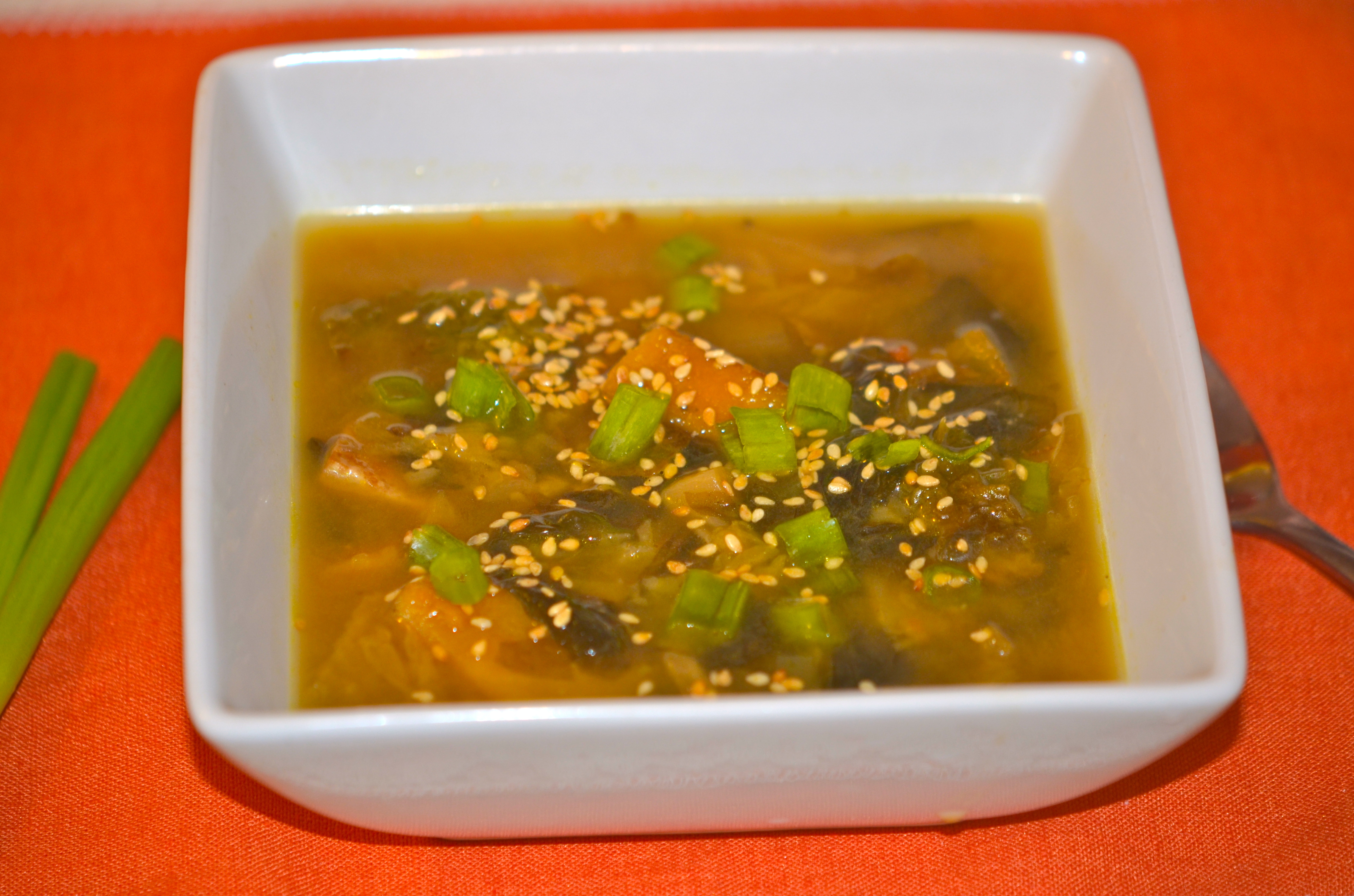 The soup includes kabocha squash, cabbage, wakame (seaweed), miso, scallions and tofu. YUM: what can go wrong with those delicious, Japanese-inspired ingredients?