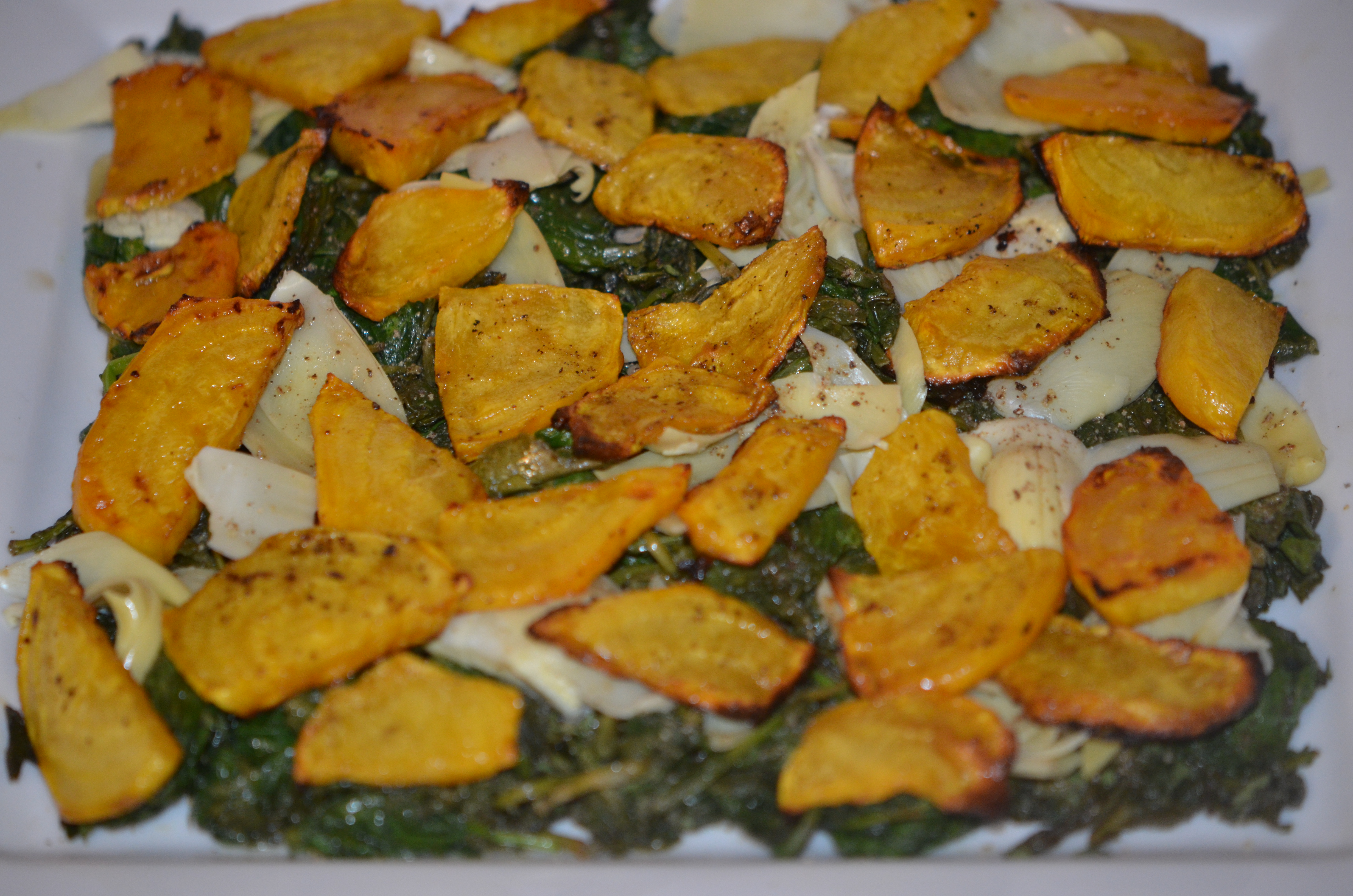 • Evenly distribute the kale on a large serving plate. Evenly lay the artichokes on top of the kale.