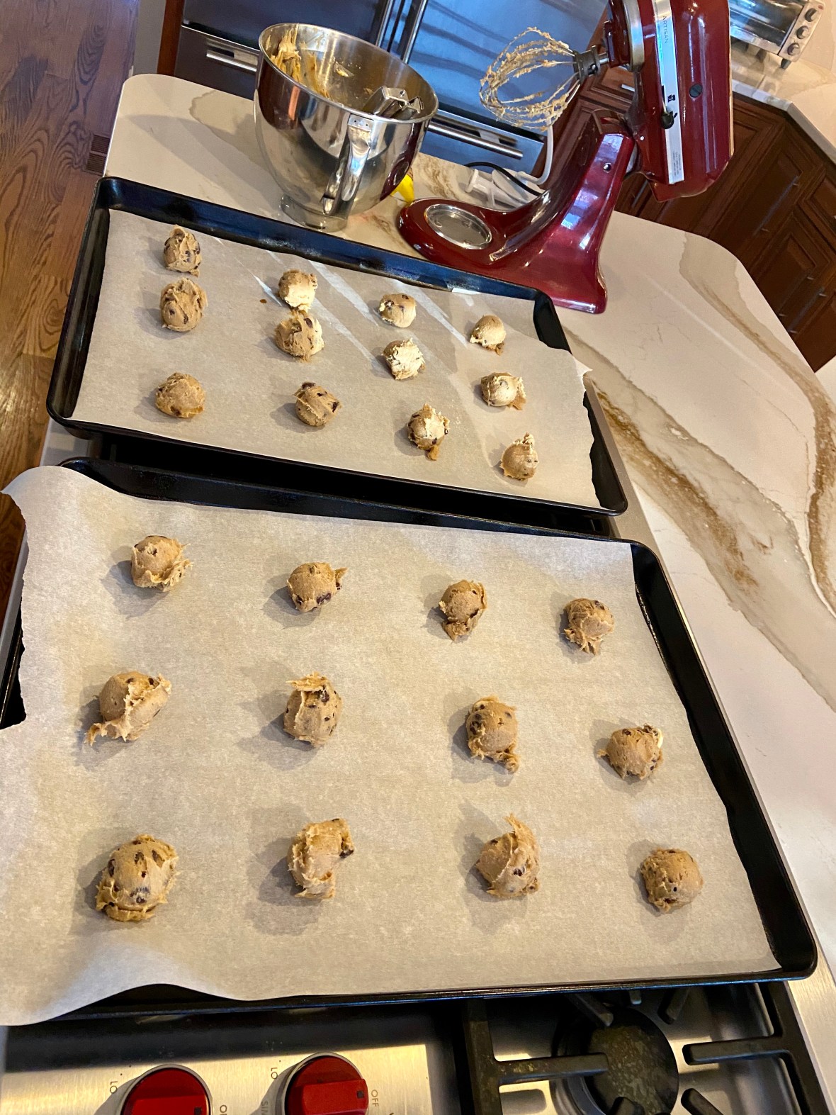 - Use a melon ball scoop to drop two tablespoon spoonfuls onto extra large cookie sheets lined with parchment paper, about 12 cookies per tray. Do not overcrowd cookies.