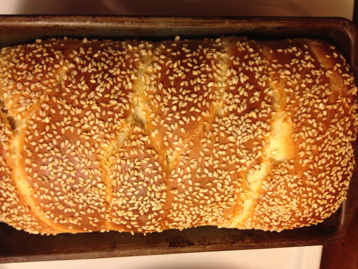 Baked challah in pan.